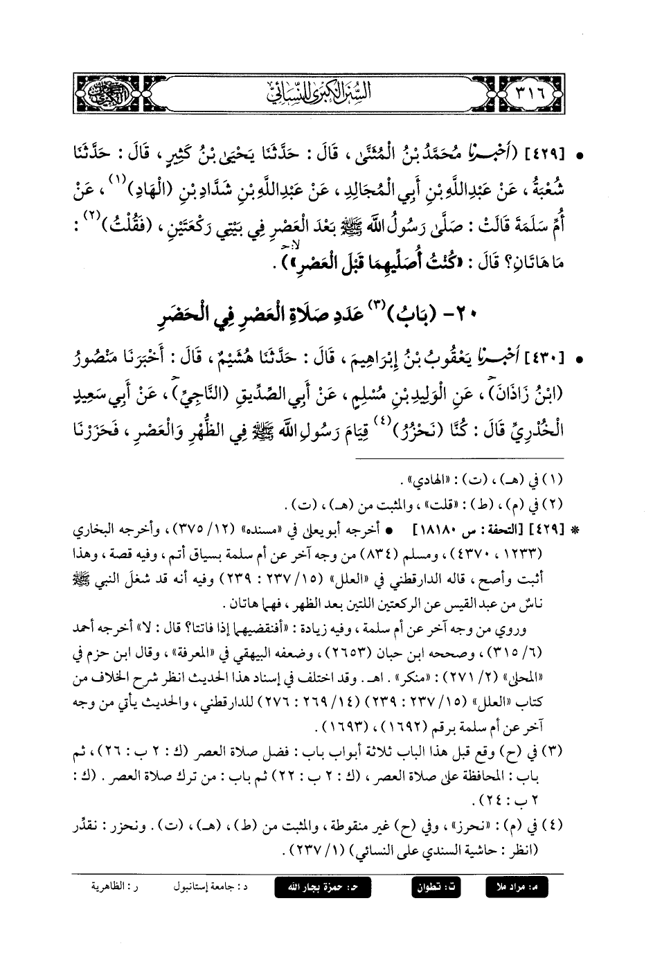 430- أَخبَرنا يَعقُوبُ بنُ إِبرَاهِيمَ، قَالَ: حَدثنا هُشَيْمٌ، قَالَ: أَخبَرنا مَنصُورُ بنُ زَذَانَ، عَنِ الوَلِيدِ بنِ مُسْلِمٍ، عَن أَبي الصِّدِّيقِ النَّاجِيِّ، عَن أَبي سَعِيدٍ الخُدْرِيِّ، قَالَ: كُنَّا نَحْزُرُ قِيَامَ رَسُولِ اللهِ صَلى الله عَليه وسَلم فِي الظُّهْرِ وَالعَصْرِ، فَحَزَرْنَا قِيَامَهُ فِي الظُّهْرِ قَدْرَ ثَلاثِينَ آيَةً، قَدْرَ سُورَةِ السَّجْدَةِ فِي الرَّكْعَتَيْنِ الأُولَتَيْنِ، وَفِي الأُخْرَتَيْنِ عَلَى النِّصْفِ مِنْ ذَلِكَ، وَحَزَرْنَا قِيَامَهُ فِي الرَّكْعَتَيْنِ الأُولَتَيْنِ مِنَ العَصْرِ عَلَى قَدْرِ الأُخْرَتَيْنِ مِنَ الظُّهْرِ، وَحَزَرْنَا قِيَامَهُ فِي الرَّكْعَتَيْنِ الأُخْرَتَيْنِ مِنَ العَصْرِ عَلَى النِّصْفِ مِنْ ذَلِكَ.