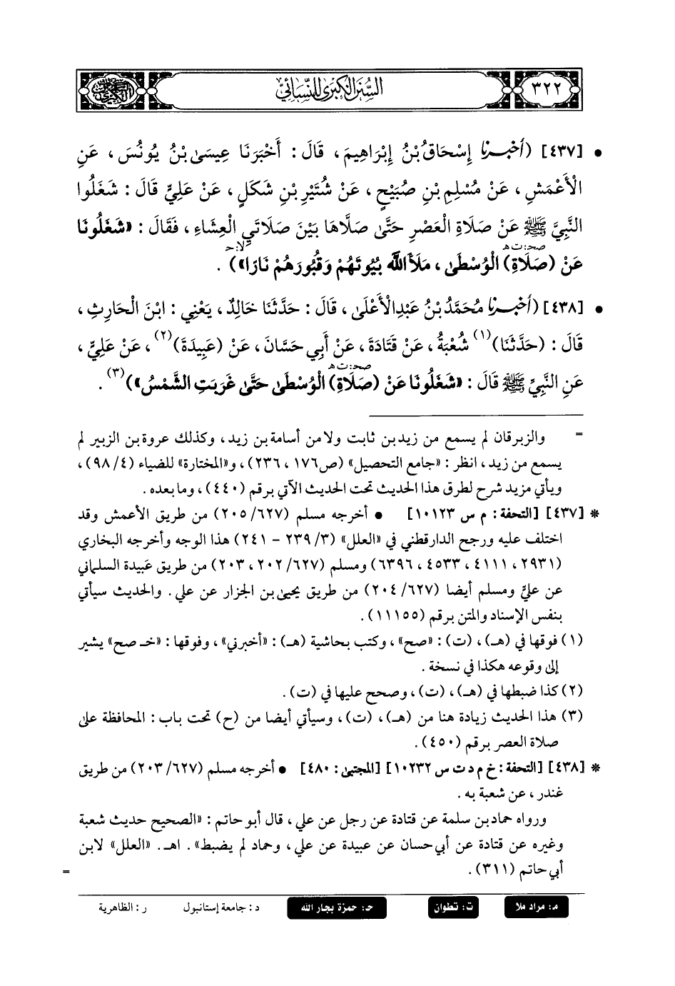 437- أَخبَرنا إِسحَاقُ بنُ إِبرَاهِيمَ، قَالَ: أَخبَرنا عِيسَى بنُ يُونُسَ، عَنِ الأَعْمَشِ، عَن مُسْلِمِ بنِ صُبَيْحٍ، عَن شُتَيْرِ بنِ شَكَلٍ، عَن عَليٍّ، قَالَ: شَغَلُوا النَّبيَّ صَلى الله عَليه وسَلم عَن صَلاةِ العَصْرِ حَتَّى صَلاَّهَا بَيْنَ صَلاتِي العِشَاءِ، فَقَالَ: شَغَلُونَا عَن صَلاةِ الوُسْطَى مَلأَ اللهُ بُيُوتَهُمْ وَقُبُورَهُمْ نَارًا.