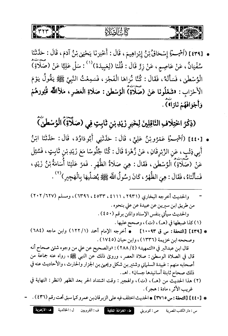439- أَخبَرنا إِسحَاقُ بنُ إِبرَاهِيمَ، قَالَ: أَخبَرنا يَحيَى بنُ آدَمَ، قَالَ: حَدثنا سُفيانُ، عَن عَاصِمٍ، عَن زِرٍّ، قَالَ: قُلْنَا لِعَبِيدَةَ سَلْ عَليًّا عَن صَلاةِ الوُسْطَى، فَسَأَلَهُ؟ فَقَالَ: كُنَّا نُرَاهَا الفَجْرَ، فَسَمِعْتُ النَّبيَّ صَلى الله عَليه وسَلم يَقُولُ يَوْمَ الأَحْزَابِ: شَغَلُونَا عَن صَلاةِ الوُسْطَى صَلاةِ العَصْرِ مَلأَ اللهُ قُبُورَهُمْ وَأَجْوَافَهُمْ نَارًا.