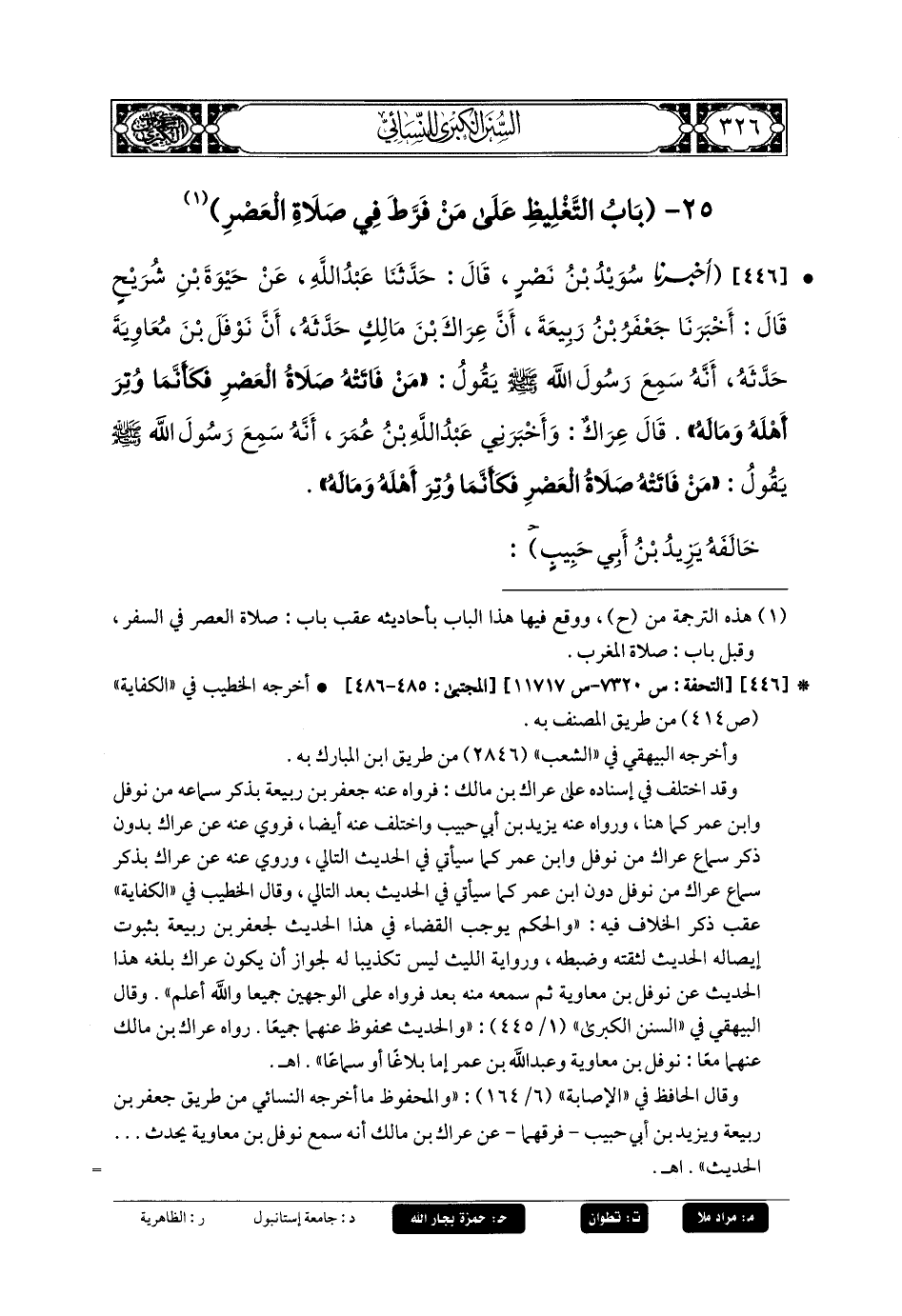 446- أَخبَرَنا سُوَيْدُ بنُ نَصْرٍ قَالَ: حَدَّثَنَا عَبدُ اللهِ، عَن حَيْوَةَ بنِ شُرَيْحٍ، قَالَ: أَخبَرَنا جَعفَرُ بنُ رَبِيعَةَ، أَنَّ عِرَاكَ بْنَ مَالِكٍ حَدَّثَهُ، أَنَّ نَوْفَلَ بْنَ مُعَاوِيَةَ حَدَّثَهُ أَنَّهُ سَمِعَ رَسُولَ اللهِ صَلى الله عَليهِ وسَلم يَقُولُ: مَنْ فَاتَتْهُ صَلاةُ العَصْرِ فَكَأَنَّمَا وُتِرَ أَهْلَهُ وَمَالَهُ.
