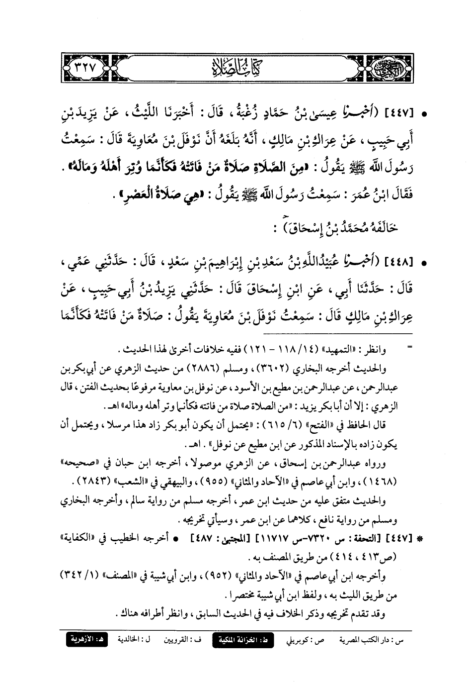 447-أَخبَرَنا عِيسَى بنُ حَمَّادٍ زُغْبَةُ، حَدَّثَنَا اللَّيْثُ، عَن يَزِيدَ بنِ أَبي حَبِيبٍ، عَن عِرَاكِ بنِ مَالِكٍ أَنَّهُ بَلَغَهُ، أَنَّ نَوْفَلَ بْنَ مُعَاوِيَةَ، قَالَ: سَمِعْتُ رَسُولَ اللهِ صَلى الله عَليهِ وسَلم يَقُولُ: مِنَ الصَّلاةِ صَلاةٌ مَنْ فَاتَتْهُ فَكَأَنَّمَا وُتِرَ أَهْلَهُ وَمَالَهُ.