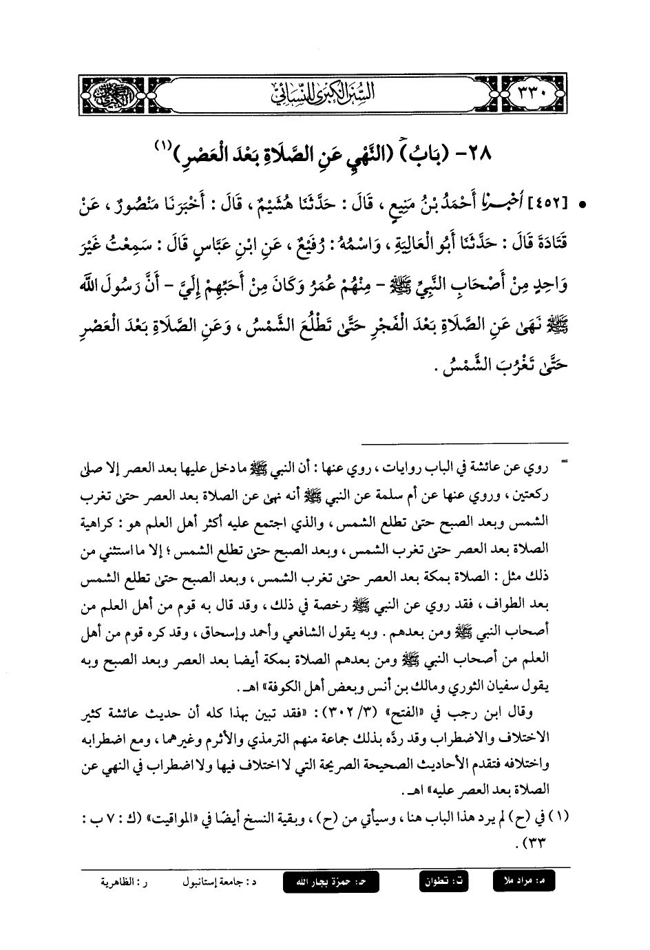 452- أَخبَرنا أَحْمَدُ بنُ مَنِيعٍ، قَالَ: حَدثنا هُشَيْمٌ، قَالَ: أَخبَرنا مَنصُورٌ، عَن قَتَادَةَ، قَالَ: حَدثنا أَبو العَالِيَةِ، وَاسْمُهُ رُفَيْعٌ، عَنِ ابنِ عَبَّاسٍ، قَالَ: سَمِعْتُ غَيْرَ وَاحِدٍ مِنْ أَصْحَابِ النَّبيِّ صَلى الله عَليه وسَلم مِنْهُمْ عُمَرُ وَكَانَ مِنْ أَحَبِّهِمْ إِلَيَّ، أَنَّ رَسُولَ اللهِ صَلى الله عَليه وسَلم نَهَى عَنِ الصَّلاةِ بَعْدَ الفَجْرِ حَتَّى تَطْلُعَ الشَّمْسُ، وَعَنِ الصَّلاةِ بَعْدَ العَصْرِ حَتَّى تَغْرُبَ الشَّمْسُ.