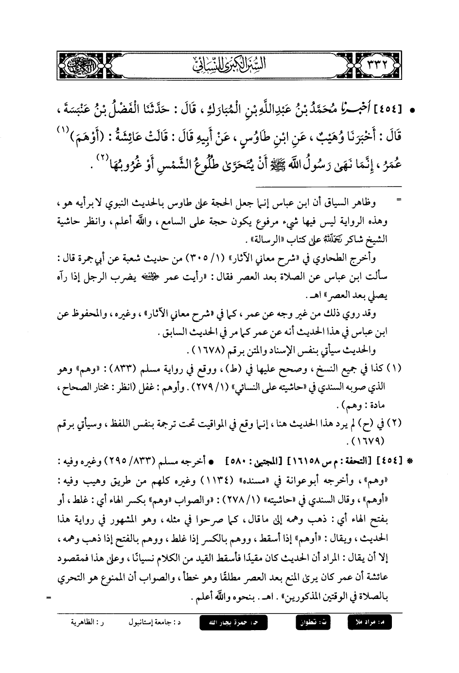 454- أَخبَرنا مُحَمدُ بنُ عَبدِ اللهِ بنِ المُبَارَكِ، قَالَ: حَدثنا الفَضْلُ بنُ عَنبَسَةَ، قَالَ: أَخبَرنا وُهَيْبُ، عَنِ ابنِ طَاوُوسٍ، عَن أَبيهِ، قَالَ: قَالَتْ عَائِشَةُ: أَوْهَمَ عُمَرُ؛ إِنَّمَا نَهَى رَسُولُ اللهِ صَلى الله عَليه وسَلم أَنْ يُتَحَرَّى طُلُوعَ الشَّمْسِ أَوْ غُرُوبِهَا.
