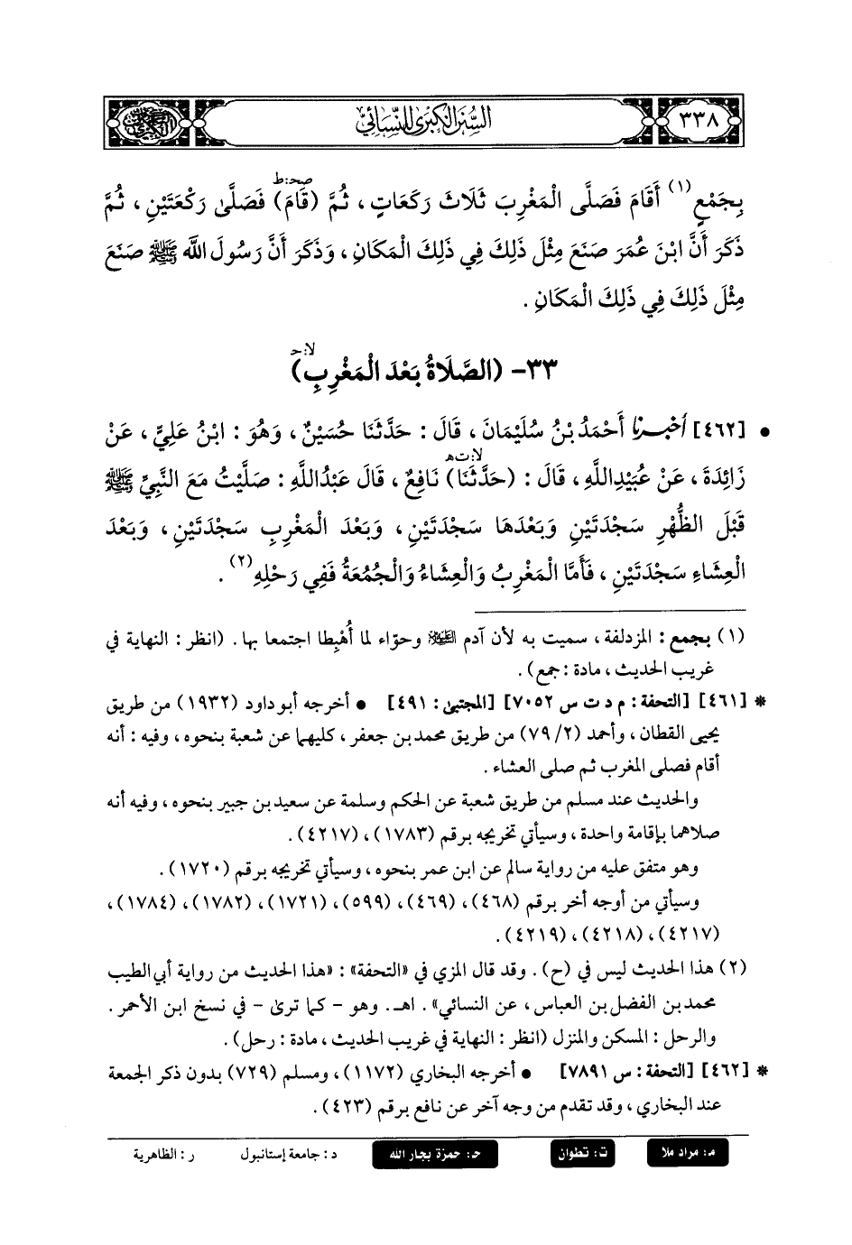 462- أَخبَرنا أَحْمَدُ بنُ سُلَيمَانَ، قَالَ: حَدثنا حُسَيْنٌ، وَهُوَ ابنُ عَليٍّ، عَن زَائِدَةَ، عَن عُبَيدِ اللهِ، قَالَ: حَدثنا نَافِعٌ، قَالَ عَبدُ اللهِ: صَلَّيْتُ مَعَ النَّبيِّ صَلى الله عَليه وسَلم قَبْلَ الظُّهْرِ سَجْدَتَيْنِ، وَبَعْدَهَا سَجْدَتَيْنِ، وَبَعْدَ المَغْرِبِ سَجْدَتَيْنِ، وَبَعْدَ العِشَاءِ سَجْدَتَيْنِ، فَأَمَّا المَغْرِبُ وَالعِشَاءُ، وَالجُمُعَةُ، فَفِي رَحْلِهِ.
