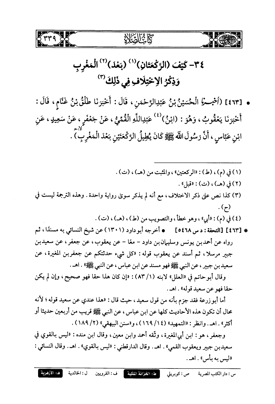 463- أَخبَرنا الحُسَيْنُ بنُ عَبدِ الرَّحمَنِ، قَالَ: أَخبَرنا طَلْقُ بنُ غَنَّامٍ، قَالَ: أَخبَرنا يَعقُوبُ، وَهُوَ ابنُ عَبدِ اللهِ القُمِّيُّ، عَن جَعفَرٍ، عَن سَعِيدٍ، عَنِ ابنِ عَبَّاسٍ، أَنَّ رَسُولَ اللهِ صَلى الله عَليه وسَلم كَانَ يُطِيلُ الرَّكْعَتَيْنِ بَعْدَ المَغْرِبِ.