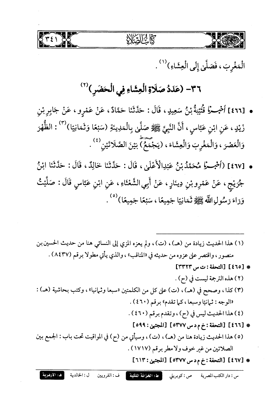 466- أَخبَرنا قُتَيبَةُ بنُ سَعِيدٍ، قَالَ: حَدثنا حَمَّادٌ، عَن عَمْرٍو، عَن جَابِرِ بنِ زَيْدٍ، عَنِ ابنِ عَبَّاسٍ، أَنَّ النَّبيَّ صَلى الله عَليه وسَلم صَلَّى بِالمَدِينَةِ سَبْعًا وَثَمَانِيًا: الظُّهْرَ، وَالعَصْرَ وَالمَغْرِبَ، وَالعِشَاءَ، يَجْمَعُ بَيْنَ الصَّلاتَيْنِ.