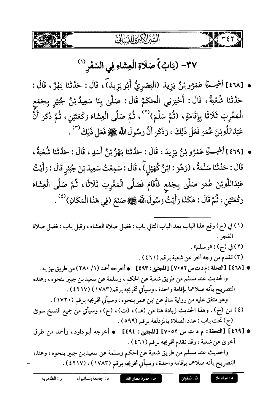 468- أَخبَرنا عَمرُو بنُ يَزِيدَ البَصْرِيُّ أَبو يَزِيدَ، قَالَ: حَدثنا بَهْزٌ، قَالَ: حَدثنا شُعبَةُ، قَالَ: أَخبَرني الحَكَمُ، قَالَ: صَلَّى بِنَا سَعِيدُ بنُ جُبَيرٍ بِجَمْعٍ المَغْرِبَ ثَلاثًا بِإِقَامَةٍ، ثُمَّ سَلَّمَ، ثُمَّ صَلَّى العِشَاءَ رَكْعَتَيْنِ، ثُمَّ ذَكَرَ أَنَّ عَبدَ اللهِ بْنَ عُمَرَ فَعَلَ ذَلِكَ، وَذَكَرَ أَنَّ رَسُولَ اللهِ صَلى الله عَليه وسَلم فَعَلَ ذَلِكَ.