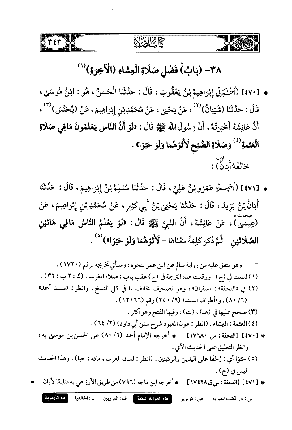 470- أَخبَرني إِبرَاهِيمُ بنُ يَعقُوبَ، قَالَ: حَدثنا الحَسَنُ، هُوَ ابنُ مُوسَى، قَالَ: حَدثنا شَيْبَانُ، عَن يَحيَى، عَن مُحَمدِ بنِ إِبرَاهِيمَ، عَن يُحَنِّسَ، أَنَّ عَائِشَةَ أَخبَرَتْهُ، أَنَّ رَسُولَ اللهِ صَلى الله عَليه وسَلم قَالَ: لَوْ أَنَّ النَّاسَ يَعْلَمُونَ مَا فِي صَلاةِ العَتَمَةِ وَصَلاةِ الصُّبْحِ لأَتَوْهُمَا وَلَوْ حَبْوًا.