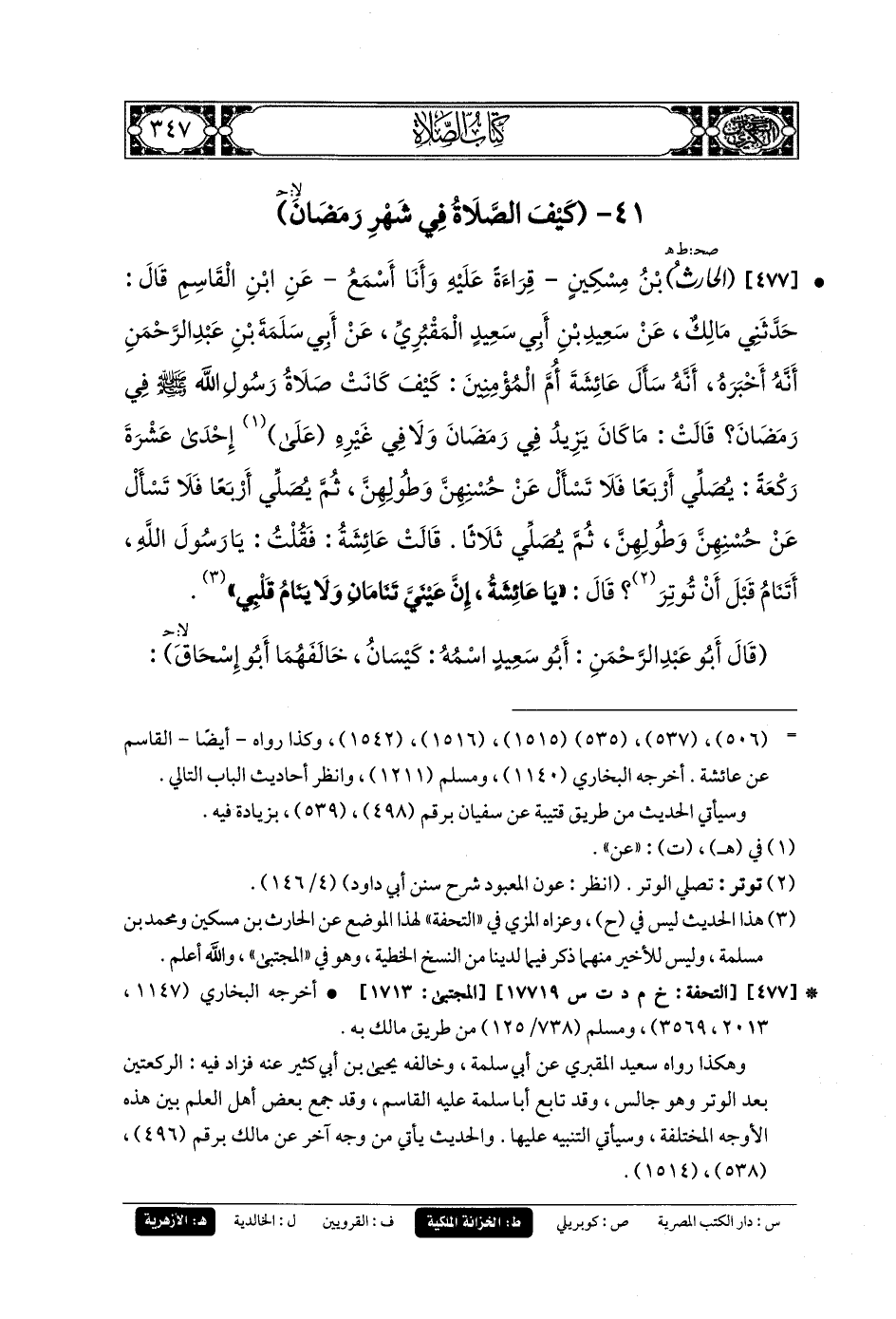 477- الحَارِثُ بنُ مِسْكِينَ، قِرَاءَةً عَلَيْهِ، وَأَنَا أَسْمَعُ، عَنِ ابنِ القَاسِمِ، قَالَ: حَدَّثني مَالِكٌ، عَن سَعِيدِ بنِ أَبي سَعِيدٍ المَقْبُرِيِّ، عَن أَبي سَلَمَةَ بنِ عَبدِ الرَّحمَنِ، أَنَّهُ أَخبَرَهُ، أَنَّهُ سَأَلَ عَائِشَةَ أُمَّ المُؤْمِنِينَ، كَيْفَ كَانَتْ صَلاةُ رَسُولِ اللهِ صَلى الله عَليه وسَلم فِي رَمَضَانَ؟ قَالَتْ: مَا كَانَ يَزِيدُ فِي رَمَضَانَ وَلا فِي غَيْرِهِ، عَلَى إِحْدَى عَشْرَةَ رَكْعَةً يُصَلِّي أَرْبَعًا فَلا تَسْأَلْ عَن حُسْنِهِنَّ وَطُولِهِنَّ، ثُمَّ يُصَلِّي أَرْبَعًا فَلا تَسْأَلْ عَن حُسْنِهِنَّ وَطُولِهِنَّ، ثُمَّ يُصَلِّي ثَلاثًا، قَالَتْ عَائِشَةُ: فَقُلْتُ: يَا رَسُولَ اللهِ، أَتَنَامُ قَبْلَ أَنْ تُوتِرَ، قَالَ: يَا عَائِشَةُ، إِنَّ عَيْنَيَّ تَنَامَانِ وَلا يَنَامُ قَلْبِي.