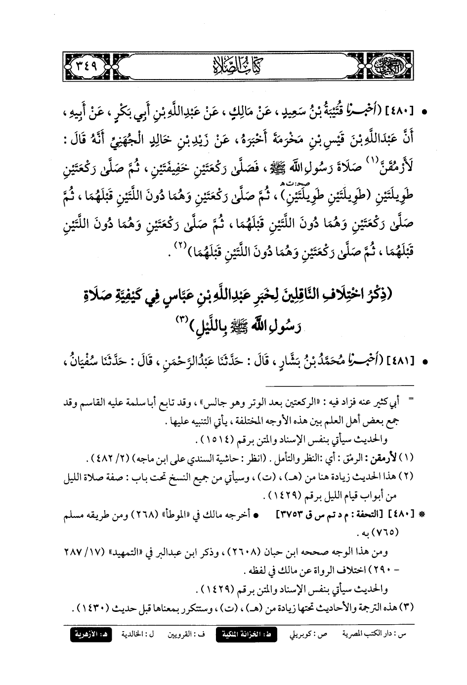 480- أَخبَرنا قُتَيبَةُ بنُ سَعِيدٍ، عَن مَالِكٍ، عَن عَبدِ اللهِ بنِ أَبي بَكْرٍ، عَن أَبيهِ، أَنَّ عَبدَ اللهِ بْنَ قَيْسِ بنِ مَخْرَمَةَ، أَخبَرَهُ عَن زَيْدِ بنِ خَالِدٍ الجُهَنِيُّ، أَنَّهُ قَالَ: لأَرْمُقَنَّ صَلاةَ رَسُولِ اللهِ صَلى الله عَليه وسَلم، فَصَلَّى رَكْعَتَيْنِ خَفِيفَتَيْنِ، ثُمَّ صَلَّى رَكْعَتَيْنِ طَوِيلَتَيْنِ طَوِيلَتَيْنِ طَوِيلَتَيْنِ، ثُمَّ صَلَّى رَكْعَتَيْنِ وَهُمَا دُونَ اللَّتَيْنِ قَبْلَهُمَا، ثُمَّ صَلَّى رَكْعَتَيْنِ وَهُمَا دُونَ اللَّتَيْنِ قَبْلَهُمَا، ثُمَّ صَلَّى رَكْعَتَيْنِ وَهُمَا دُونَ اللَّتَيْنِ قَبْلَهُمَا، ثُمَّ صَلَّى رَكْعَتَيْنِ وَهُمَا دُونَ اللَّتَيْنِ قَبْلَهُمَا.