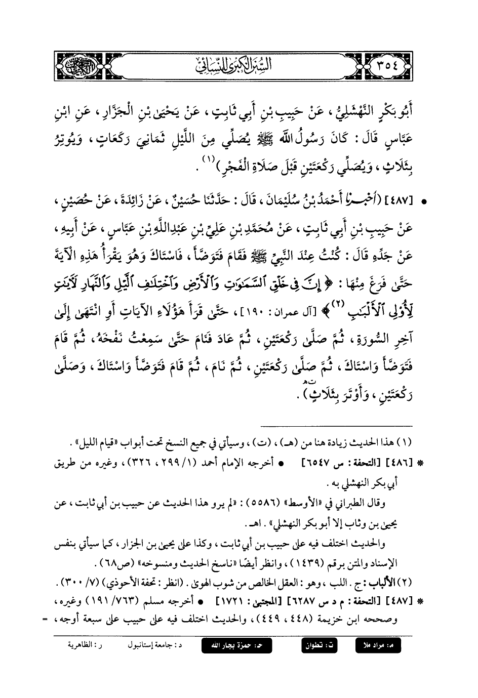 487- أَخبَرنا أَحْمَدُ بنُ سُلَيمَانَ، قَالَ: حَدثنا حُسَيْنٌ، عَن زَائِدَةَ، عَن حُصَيْنِ، عَن حَبِيبِ بنِ أَبي ثَابِتٍ، عَن مُحَمدِ بنِ عَليِّ بنِ عَبدِ اللهِ بنِ عَبَّاسٍ، عَن أَبيهِ، عَن جَدِّهِ، قَالَ: كُنْتُ عِنْدَ النَّبيَّ صَلى الله عَليه وسَلم، فَقَامَ فَتَوَضَّأَ فَاسْتَاكَ، وَهُوَ يَقْرَأُ هَذِهِ الآيَةَ، حَتَّى فَرَغَ مِنْهَا: {إِنَّ فِي خَلَقِ السَّمَاوَاتِ وَالأَرْضَ وَاخْتِلافِ اللَّيْلِ وَالنَّهَارَ لآيَاتٍ لأُولِي الأَلْبَابِ} حَتَّى قَرَأَ هَؤُلاءِ الآيَاتِ أَوِ انْتَهَى إِلَى آخِرِ السُّورَةِ، ثُمَّ صَلَّى رَكْعَتَيْنِ، ثُمَّ عَادَ فَنَامَ حَتَّى سَمِعْتُ نَفْخَهُ، ثُمَّ قَامَ فَتَوَضَّأَ وَاسْتَاكَ، ثُمَّ صَلَّى رَكْعَتَيْنِ، ثُمَّ نَامَ، ثُمَّ قَامَ فَتَوَضَّأَ، وَاسْتَاكَ، وَصَلَّى رَكْعَتَيْنِ، وَأَوْتَرَ بِثَلاثٍ.