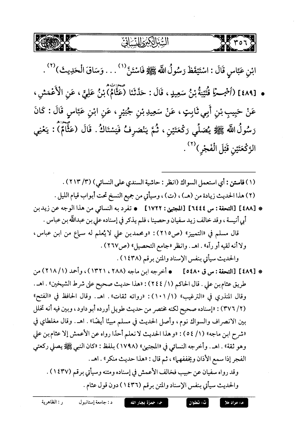 489- أَخبَرنا قُتَيبَةُ بنُ سَعِيدٍ، قَالَ: حَدثنا عَثَّامُ بنُ عَليٍّ، عَنِ الأَعْمَشِ، عَن حَبِيبِ بنِ أَبي ثَابِتٍ، عَن سَعِيدِ بنِ جُبَيرٍ، عَنِ ابنِ عَبَّاسٍ، قَالَ: كَانَ رَسُولُ اللهِ صَلى الله عَليه وسَلم يُصَلِّي رَكْعَتَيْنِ، ثُمَّ يَنْصَرِفُ فَيَسْتَاكُ. قَالَ عَثَّامٌ: يَعْنِي الرَّكْعَتَيْنِ قَبْلَ الفَجْرِ.