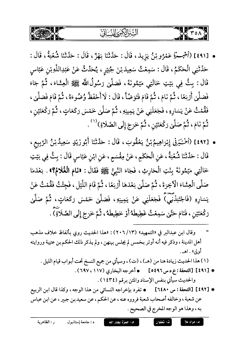 491- أَخبَرنا عَمرُو بنُ يَزِيدَ، قَالَ: حَدثنا بَهْزٌ، قَالَ: حَدثنا شُعبَةُ، قَالَ: حَدَّثني الحَكَمُ، قَالَ: سَمِعْتُ سَعِيدَ بْنَ جُبَيرٍ، يُحَدِّثُ، عَن عَبدِ اللهِ بنِ عَبَّاسِ، قَالَ: بِتُّ فِي بَيْتِ خَالَتِي مَيْمُونَةَ، فَصَلَّى رَسُولُ اللهِ صَلى الله عَليه وسَلم العِشَاءَ، ثُمَّ جَاءَ فَصَلَّى أَرْبَعًا، ثُمَّ نَامَ، ثُمَّ قَامَ فَتَوَضَّأَ، قَالَ: لا أَحْفَظُ وُضُوءَهُ، ثُمَّ قَامَ فَصَلَّى فَقُمْتُ عَن يَسَارِهِ، فَجَعَلَنِي عَن يَمِينِهِ، ثُمَّ صَلَّى خَمْسَ رَكَعَاتٍ، ثُمَّ رَكْعَتَيْنِ، ثُمَّ نَامَ، ثُمَّ صَلَّى رَكْعَتَيْنِ، ثُمَّ خَرَجَ إِلَى الصَّلاةِ.
