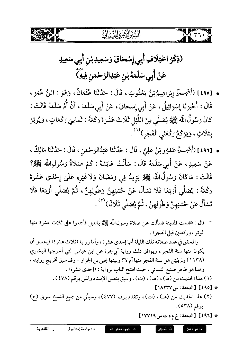 496- أَخبَرنا عَمرُو بنُ عَليٍّ، قَالَ: حَدثنا عَبدُ الرَّحمَنِ، قَالَ: حَدثنا مَالِكٌ، عَن سَعِيدٍ، عَن أَبي سَلَمَةَ، قَالَ: سَأَلْتُ عَائِشَةَ كَمْ صَلاةُ رَسُولِ اللهِ صَلى الله عَليه وسَلم؟ قَالَتْ: مَا كَانَ رَسُولُ اللهِ صَلى الله عَليه وسَلم يَزِيدُ فِي رَمَضَانَ، وَلا غَيْرِهِ، عَلَى إِحْدَى عَشْرَةَ رَكْعَةً، يُصَلِّي أَرْبَعًا فَلا تَسْأَلْ عَن حُسْنِهِنَّ وَطُولِهِنَّ، ثُمَّ يُصَلِّي أَرْبَعًا فَلا تَسْأَلْ عَن حُسْنِهِنَّ وَطُولِهِنَّ، ثُمَّ يُصَلِّي ثَلاثًا.