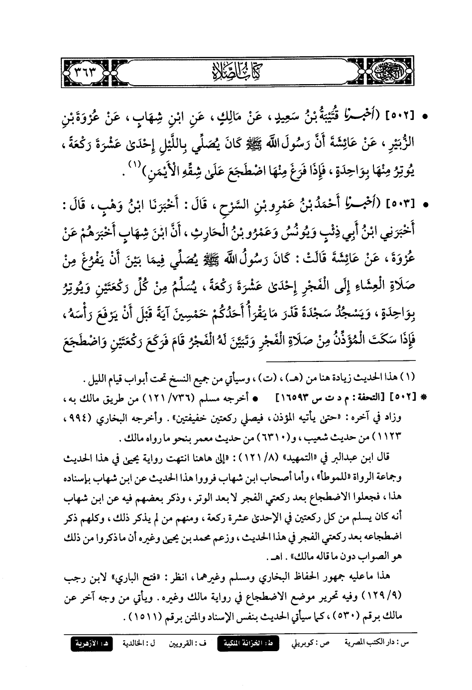 502- أَخبَرنا قُتَيبَةُ بنُ سَعِيدٍ، عَن مَالِكٍ، عَنِ ابنِ شِهَابٍ، عَن عُرْوَةَ بنِ الزُّبَيْرِ، عَن عَائِشَةَ، أَنَّ رَسُولَ اللهِ صَلى الله عَليه وسَلم كَانَ يُصَلِّي بِاللَّيْلِ إِحْدَى عَشْرَةَ رَكْعَةً، يُوتِرُ مِنْهَا بِوَاحِدَةٍ، فَإِذَا فَرَغَ مِنْهَا اضْطَجَعَ عَلَى شِقِّهِ الأَيْمَنَ.