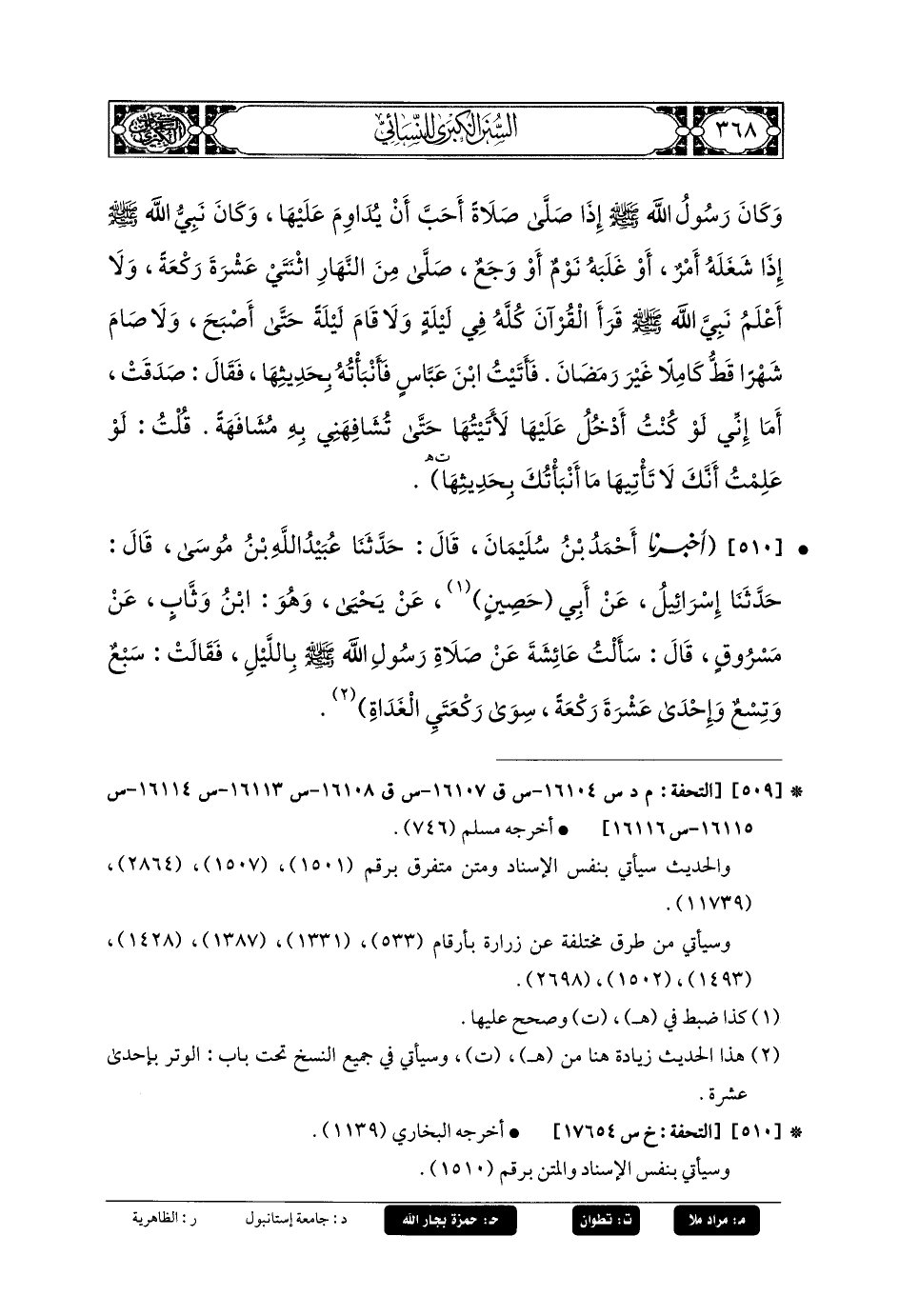 510- أَخبَرنا أَحْمَدُ بنُ سُلَيمَانَ، قَالَ: حَدثنا عُبَيدُ اللهِ بنُ مُوسَى، قَالَ: حَدثنا إِسرَائِيلُ، عَن أَبي حَصِينٍ، عَن يَحيَى، وَهُوَ ابنُ وَثَّابٍ، عَن مَسْرُوقٍ، قَالَ: سَأَلْتُ عَائِشَةَ عَن صَلاةِ رَسُولِ اللهِ صَلى الله عَليه وسَلم بِاللَّيْلِ؟ فَقَالَتْ: سَبْعٌ وَتِسْعٌ وَإِحْدَى عَشْرَةَ رَكْعَةً سِوَى رَكْعَتَيِ الغَدَاةِ.