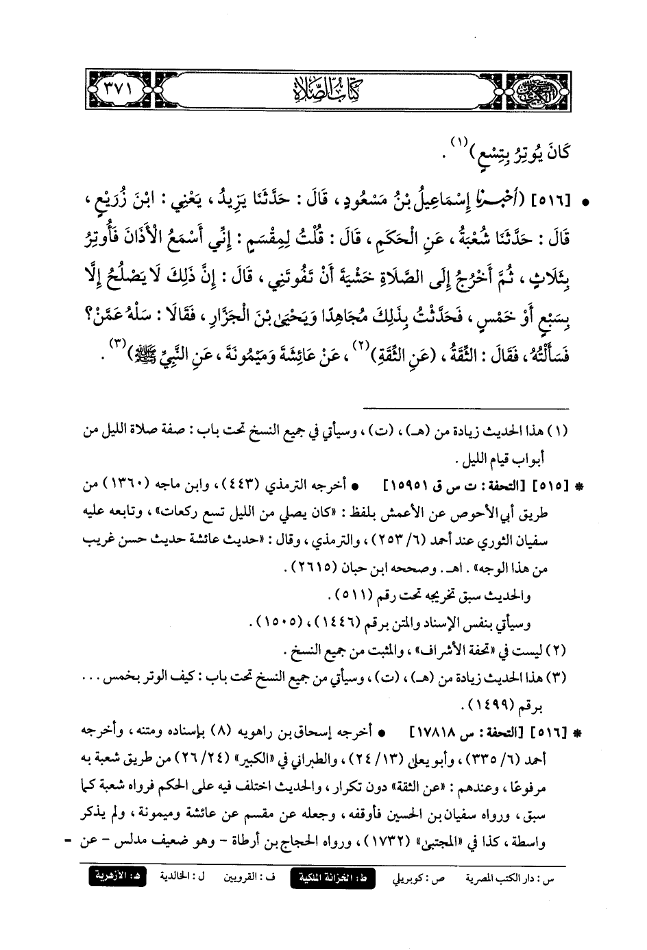 516- أَخبَرنا إِسمَاعِيلُ بنُ مَسْعُودٍ، قَالَ: حَدثنا يَزِيدُ، يَعْنِي بنُ زُرَيْعٍ، قَالَ: حَدثنا شُعبَةُ، عَنِ الحَكَمِ، قَالَ: قُلْتُ لِمِقْسَمٍ: إِنِّي أَسْمَعُ الأَذَانَ فَأَوْتِرُ بِثَلاثٍ، ثُمَّ أَخْرُجُ إِلَى الصَّلاةِ خَشْيَةَ أَنْ تَفُوتَنِي، قَالَ: إِنَّ ذَلِكَ لا يَصْلُحُ إِلاَّ بِسَبْعٍ أَوْ خَمْسٍ، فَحَدَّثْتُ بِذَلِكَ مُجَاهِدًا، وَيَحيَى بْنَ الجَزَّارِ، فَقَالا: سَلْهُ عَمَّنْ، فَسَأَلْتُهُ، فَقَالَ: الثِّقَةُ، عَنِ الثِّقَةِ، عَن عَائِشَةَ، وَمَيْمُونَةَ، عَنِ النَّبيِّ صَلى الله عَليه وسَلم.