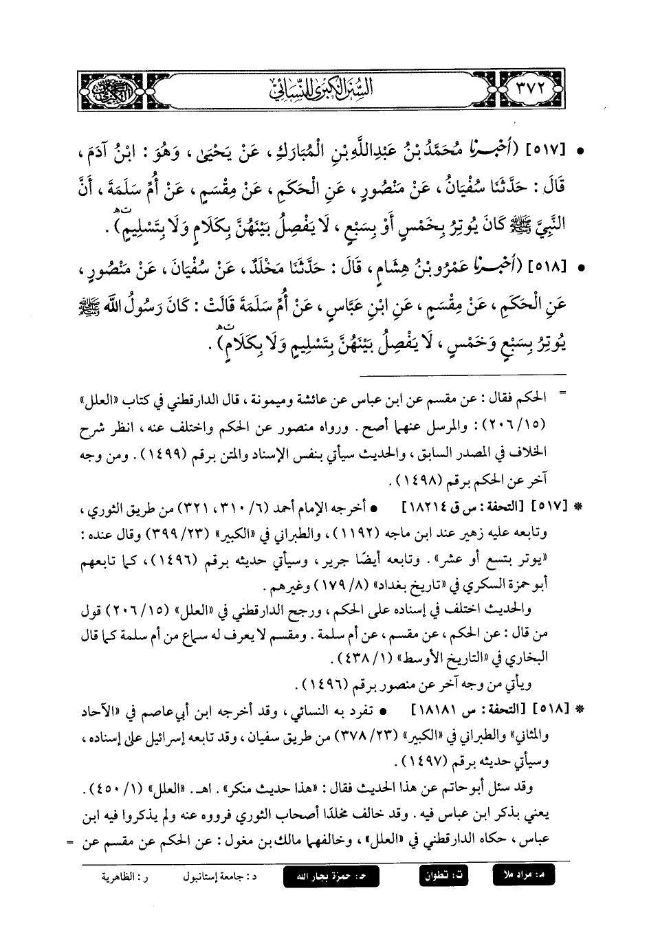 518- أَخبَرنا عَمرُو بنُ هِشَامٍ، قَالَ: حَدثنا مَخْلَدٌ، عَن سُفيانَ، عَن مَنصُورٍ، عَنِ الحَكَمِ، عَن مِقْسَمٍ، عَنِ ابنِ عَبَّاسٍ، عَن أُمِّ سَلَمَةَ، قَالَتْ: كَانَ رَسُولُ اللهِ صَلى الله عَليه وسَلم يُوتِرُ بِسَبْعٍ وَخَمْسٍ لا يَفْصِلُ بَيْنَهُنَّ بِتَسْلِيمٍ وَلا بِكَلامٍ.