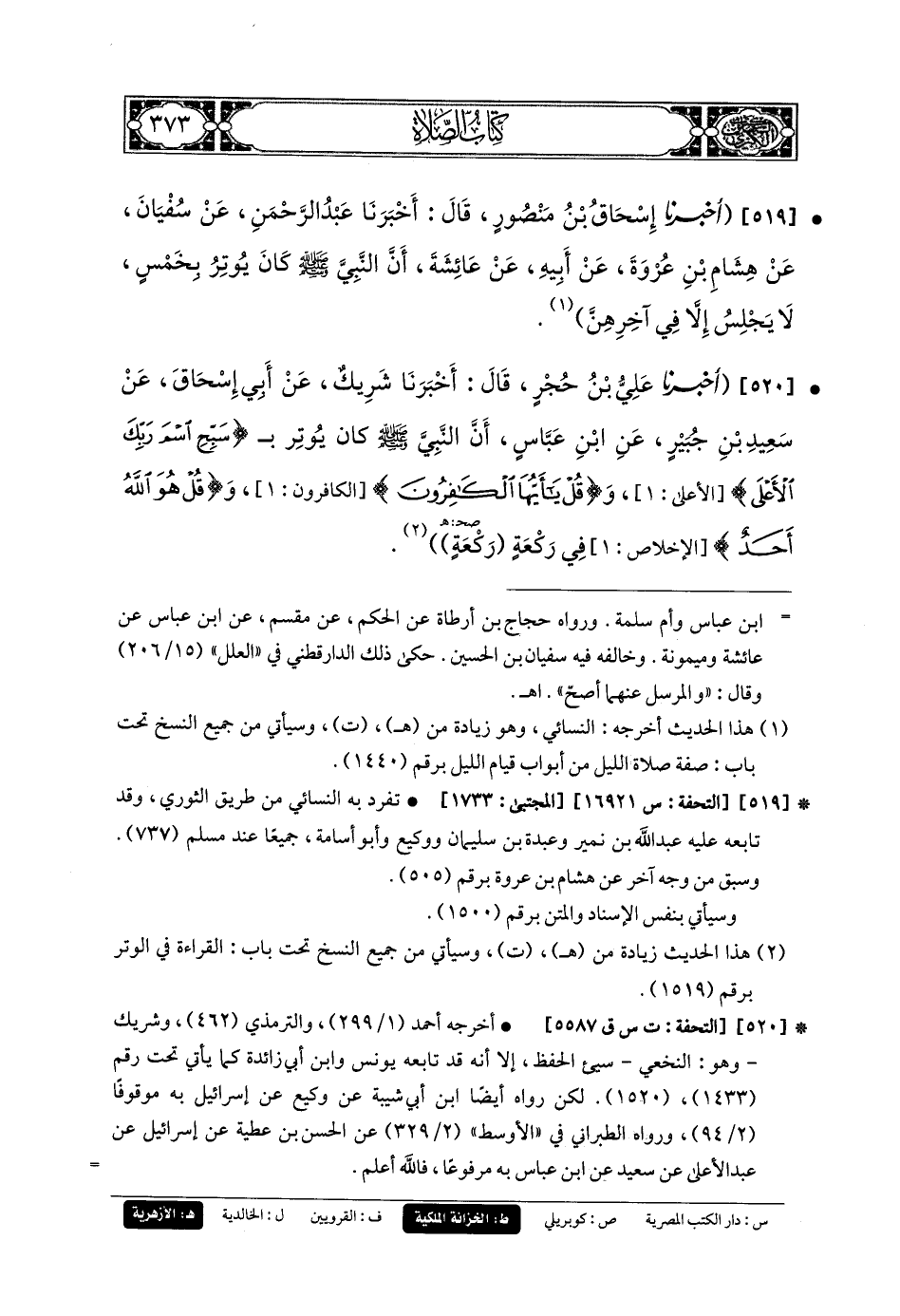 520- أَخبَرنا عَليُّ بنُ حُجْرٍ، قَالَ: أَخبَرنا شَرِيكٌ، عَن أَبي إِسحَاقَ، عَن سَعِيدِ بنِ جُبَيرٍ، عَنِ ابنِ عَبَّاسٍ، أَنَّ النَّبيَّ صَلى الله عَليه وسَلم كَانَ يُوتِرُ بِـ {سَبِّحِ اسْمِ رَبِّكَ الأَعْلَى}، وَ{قُلْ يَا أَيُّهَا الكَافِرُونَ}، وَ{قُلْ هُوَ اللهُ أَحَدٌ} فِي رَكْعَةٍ رَكْعَةٍ.