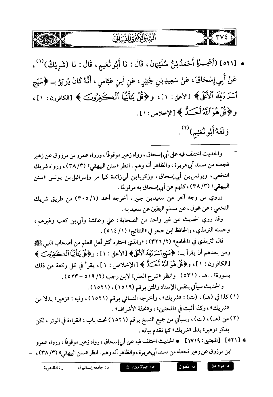 521- أَخبَرنا أَحْمَدُ بنُ سُلَيمَانَ، قَالَ: حَدثنا أَبو نُعَيْمٍ، قَالَ: حَدثنا زُهَيْرٌ (1)، عَن أَبي إِسحَاقَ، عَن سَعِيدِ بنِ جُبَيرٍ، عَنِ ابنِ عَبَّاسٍ، أَنَّهُ كَانَ يُوتِرُ بِـ {سَبِّحِ اسْمِ رَبِّكَ الأَعْلَى}، وَ {قُلْ يَا أَيُّهَا الكَافِرُونَ}، وَ {قُلْ هُوَ اللهُ أَحَدٌ}.