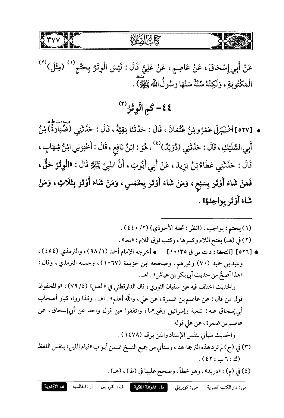 527- أَخبَرني عَمرُو بنُ عُثْمَانَ، قَالَ: حَدثنا بَقِيَّةُ، قَالَ: حَدَّثني ضُبَارَةُ بنُ أَبي السُّلَيكِ، قَالَ: حَدَّثني دُوَيْدٌ، هُوَ ابنُ نَافِعٍ، قَالَ: أَخبَرني ابنُ شِهَابٍ، قَالَ: حَدَّثني عَطَاءُ بنُ يَزِيدَ، عَن أَبي أَيوبَ، أَنَّ النَّبيَّ صَلى الله عَليه وسَلم قَالَ: الوِتْرُ حَقٌّ فَمَنْ شَاءَ أَوْتَرَ بِسَبْعٍ، وَمَنْ شَاءَ أَوْتَرَ بِخَمْسٍ، وَمَنْ شَاءَ أَوْتَرَ بِثَلاثٍ، وَمَنْ شَاءَ أَوْتَرَ بِوَاحِدَةٍ.