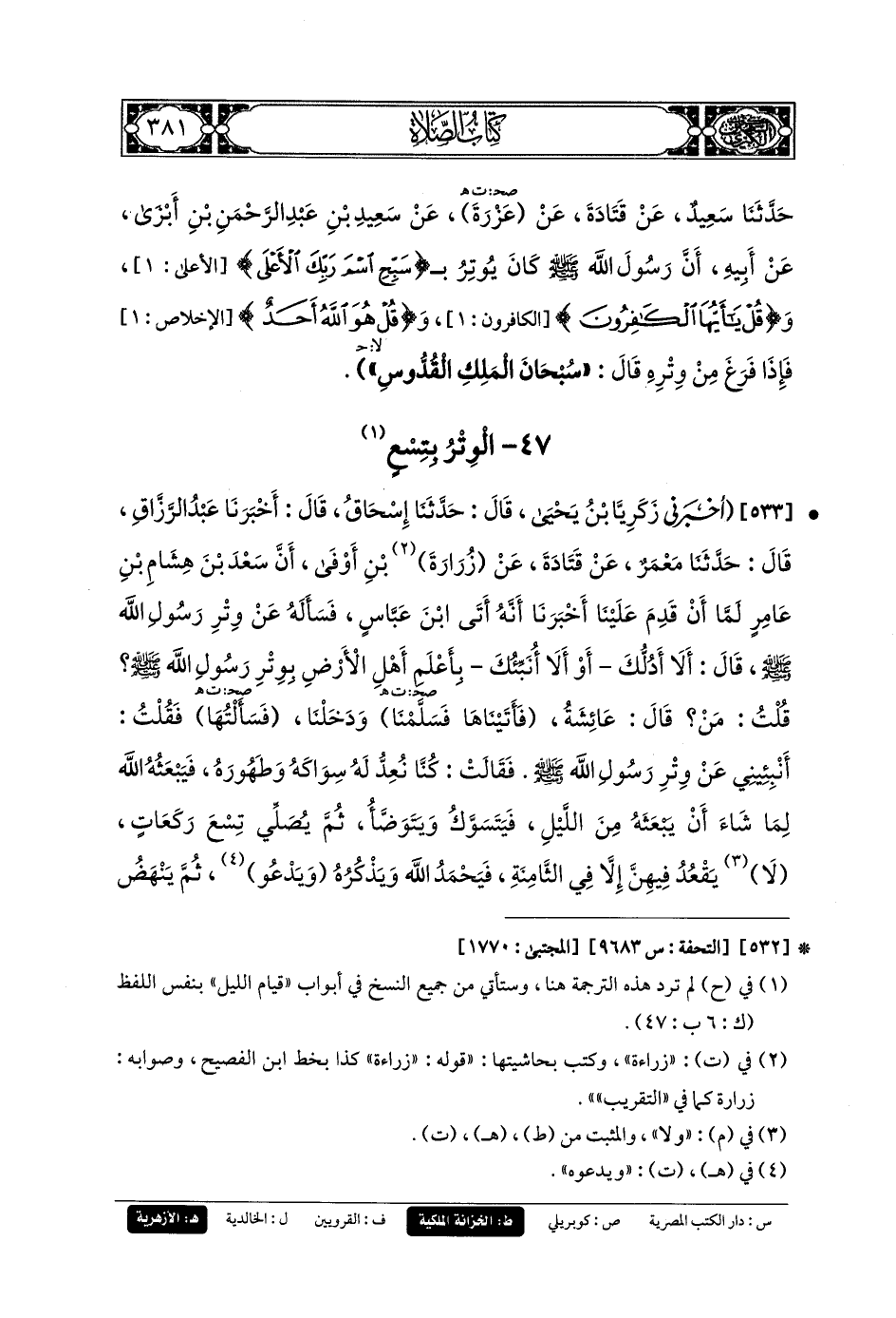 533- أَخبَرني زَكَرِيَّا بنُ يَحيَى، قَالَ: حَدثنا إِسحَاقُ، قَالَ: أَخبَرنا عَبدُ الرَّزَّاقِ، قَالَ: حَدثنا مَعْمَرٌ، عَن قَتَادَةَ، عَن زُرَارَةَ بنِ أَوْفَى، أَنَّ سَعْدَ بنِ هِشَامِ بنِ عَامِرٍ لَمَّا أَنْ قَدِمَ عَلَيْنَا، أَخبَرنا أَنَّهُ أَتَى ابنَ عَبَّاسٍ، فَسَأَلَهُ عَن وِتْرِ رَسُولِ اللهِ صَلى الله عَليه وسَلم؟ قَالَ: أَلا أَدُلُّكَ أَوْ أَلا أُنَبِّئُكَ بِأَعْلَمِ أَهْلِ الأَرْضِ بِوِتْرِ رَسُولِ اللهِ صَلى الله عَليه وسَلم؟ قُلْتُ: مَنْ؟ قَالَ: عَائِشَةُ، فَأَتَيْنَاهَا فَسَلَّمْنَا وَدَخَلْنَا، فَسَأَلْتُهَا، فَقُلْتُ: أَنْبِئِينِي عَن وِتْرِ رَسُولِ اللهِ صَلى الله عَليه وسَلم، فَقَالَتْ: كُنَّا نُعِدُّ لَهُ سِوَاكَهُ وَطُهُورَهُ، فَيَبْعَثُهُ اللهُ لِمَا شَاءَ أَنْ يَبْعَثَهُ مِنَ اللَّيْلِ فَيَتَسَوَّكُ وَيَتَوَضَّأُ، ثُمَّ يُصَلِّي تِسْعَ رَكَعَاتٍ لا يَقْعُدُ فِيهِنَّ إِلاَّ فِي الثَّامِنَةِ فَيَحْمَدُ اللهَ وَيَذْكُرُهُ وَيَدْعُوهُ، ثُمَّ يَنْهَضُ وَلا يُسَلِّمُ، فَيُصَلِّي التَّاسِعَةَ فَيَجْلِسُ فَيَحْمَدُ اللهَ وَيَذْكُرُهُ وَيَدْعُوهُ، ثُمَّ يُسَلِّمُ تَسْلِيمًا يُسْمِعُنَا، ثُمَّ يُصَلِّي رَكْعَتَيْنِ وَهُوَ جَالِسٌ، فَتِلْكَ إِحْدَى عَشْرَةَ أَيْ بُنَيَّ، فَلَمَّا أَسَنَّ رَسُولَ اللهِ صَلى الله عَليه وسَلم وَأَخَذَ اللَّحْمَ أَوْتَرَ بِسَبْعٍ، ثُمَّ يُصَلِّي رَكْعَتَيْنِ وَهُوَ جَالِسٌ، بَعْدَ مَا يُسَلِّمُ، فَتِلْكَ تِسْعًا أَيْ بُنَيَّ وَكَانَ رَسُولُ اللهِ صَلى الله عَليه وسَلم إِذَا صَلَّى صَلاةً أَحَبَّ أَنْ يُدَاوِمَ عَلَيْهَا.