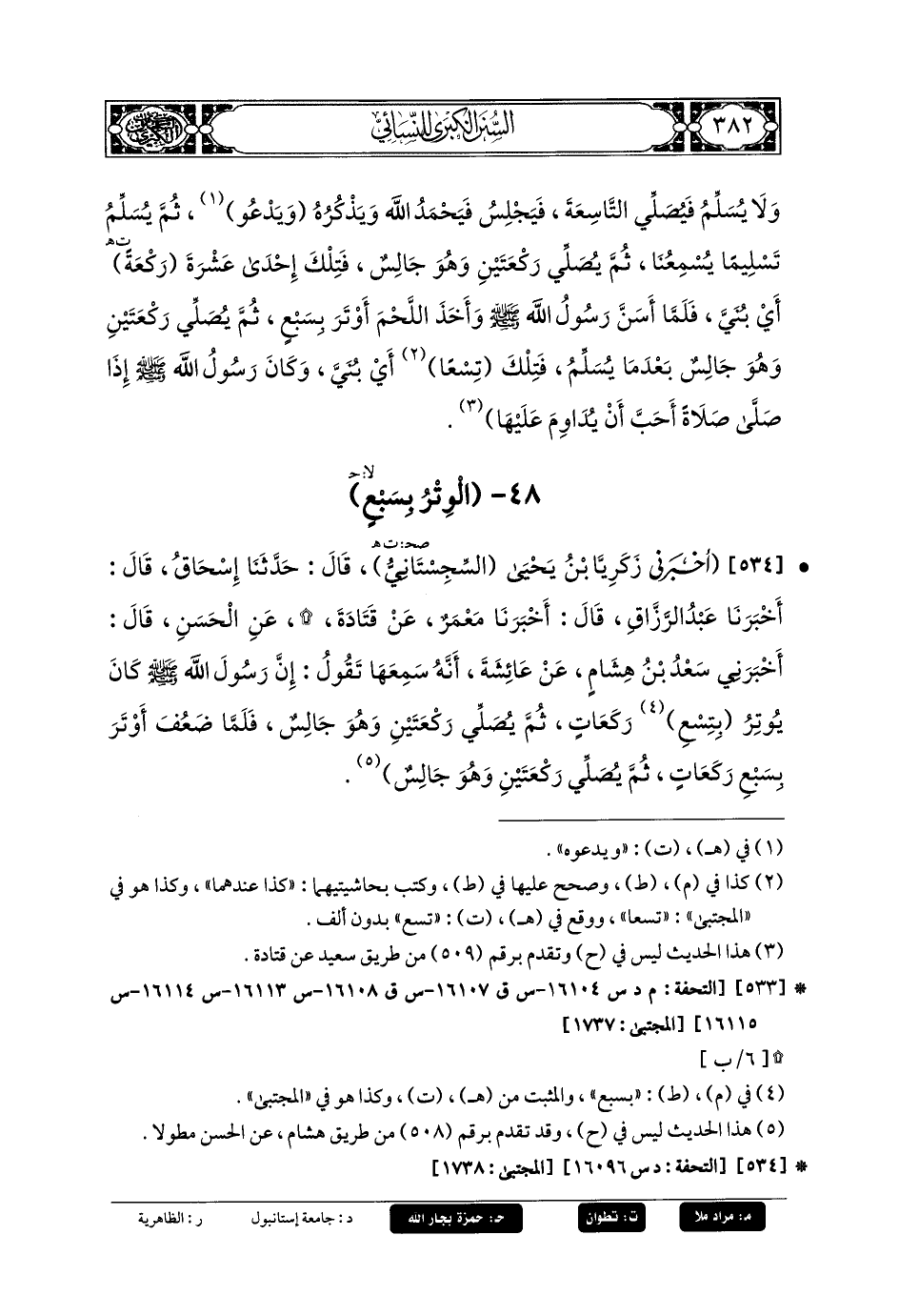 534- أَخبَرني زَكَرِيَّا بنُ يَحيَى السِّجِسْتَانِيُّ، قَالَ: حَدثنا إِسحَاقُ، قَالَ: أَخبَرنا عَبدُ الرَّزَّاقِ، قَالَ: أَخبَرنا مَعْمَرٌ، عَن قَتَادَةَ، عَنِ الحَسَنِ، قَالَ: أَخبَرني سَعْدُ بنُ هِشَامٍ، عَن عَائِشَةَ، أَنَّهُ سَمِعَهَا تَقُولُ: إِنَّ رَسُولَ اللهِ صَلى الله عَليه وسَلم كَانَ يُوتِرُ بِتِسْعِ رَكَعَاتٍ، ثُمَّ يُصَلِّي رَكْعَتَيْنِ وَهُوَ جَالِسٌ، فَلَمَّا ضَعُفَ أَوْتَرَ بِسَبْعِ رَكَعَاتٍ، ثُمَّ يُصَلِّي رَكْعَتَيْنِ وَهُوَ جَالِسٌ.