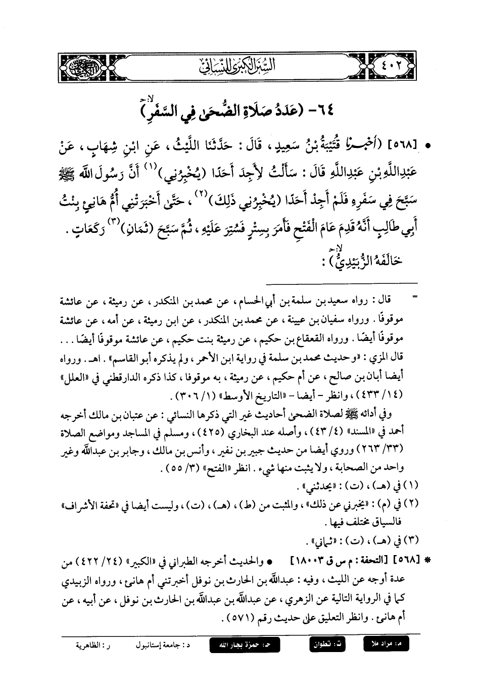 568- أَخبَرنا قُتَيبَةُ بنُ سَعِيدٍ، قَالَ: حَدثنا اللَّيْثُ، عَنِ ابنِ شِهَابٍ، عَن عَبدِ اللهِ بنِ عَبدِ اللهِ، قَالَ: سَأَلْتُ لأَجِدَ أَحَدًا يُخْبِرُنِِي أَنَّ رَسُولَ اللهِ صَلى الله عَليه وسَلم سَبَّحَ فِي سَفَرِهِ، فَلَمْ أَجِدْ أَحَدًا يُخْبِرُنِي ذَلِكَ، حَتَّى أَخبَرَتْنِي أُمُّ هَانِئٍ بِنْتُ أَبي طَالِبٍ، أَنَّهُ قَدِمَ عَامَ الفَتْحِ فَأَمَرَ بِسِتْرٍ فَسُتِرَ عَلَيْهِ، ثُمَّ سَبَّحَ ثَمَانِ رَكَعَاتٍ.
