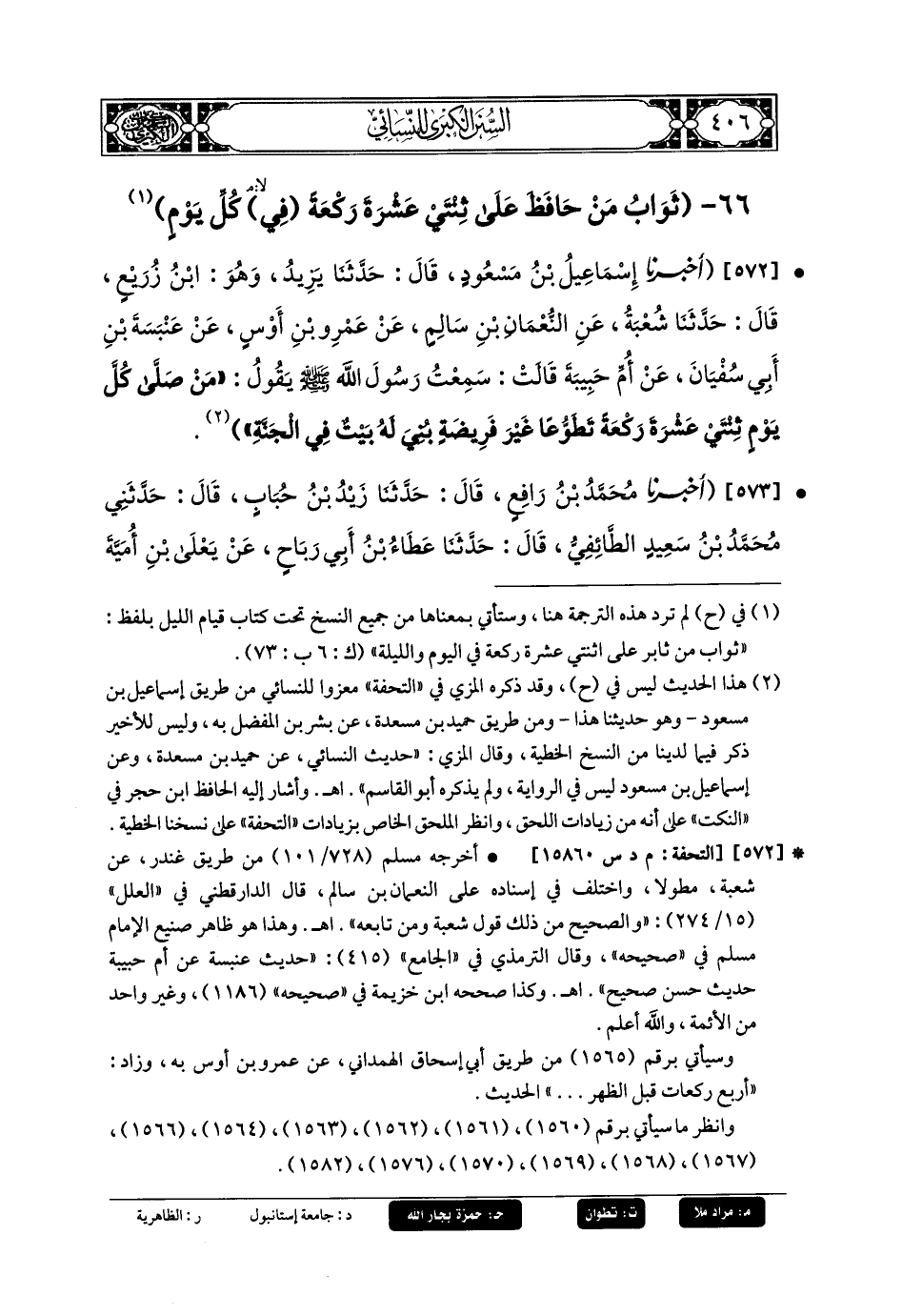 572- أَخبَرنا إِسمَاعِيلُ بنُ مَسْعُودٍ، قَالَ: حَدثنا يَزِيدُ، وَهُوَ ابنُ زُرَيْعٍ، قَالَ: حَدثنا شُعبَةُ، عَنِ النُّعْمَانِ بنِ سَالِمٍ، عَن عَمْرِو بنِ أَوْسٍ، عَن عَنبَسَةَ بنِ أَبي سُفيانَ، عَن أُمِّ حَبِيبَةَ، قَالَتْ: سَمِعْتُ رَسُولَ اللهِ صَلى الله عَليه وسَلم، يَقُولُ: مَنْ صَلَّى كُلَّ يَوْمٍ ثِنْتَيْ عَشْرَةً رَكْعَةً تَطَوُّعًا غَيْرَ فَرِيضَةٍ بُنِيَ لَهُ بَيْتٌ فِي الجَنَّةِ.