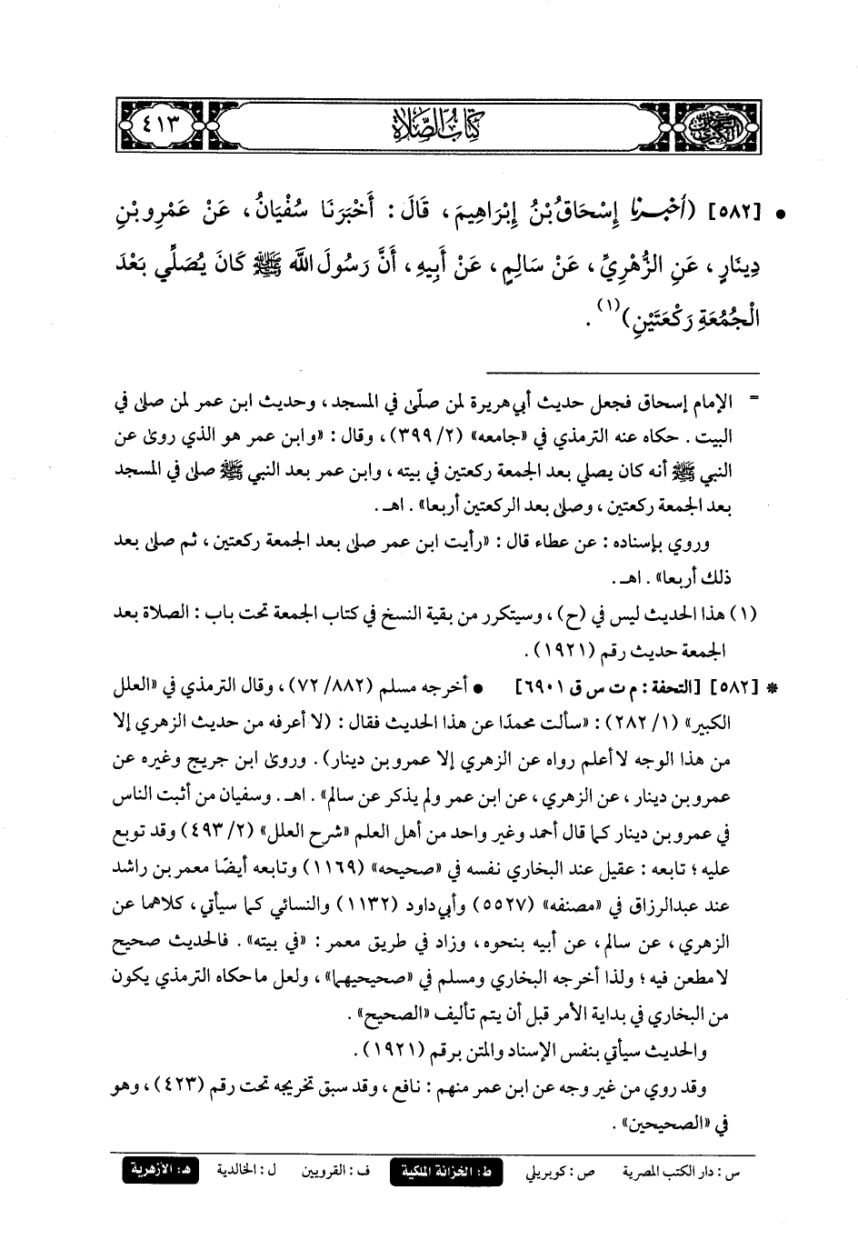 582- أَخبَرنا إِسحَاقُ بنُ إِبرَاهِيمَ، قَالَ: أَخبَرنا سُفيانُ، عَن عَمْرِو بنِ دِينَارٍ، عَنِ الزُّهْرِيِّ، عَن سَالِمٍ، عَن أَبيهِ، أَنَّ رَسُولَ اللهِ صَلى الله عَليه وسَلم كَانَ يُصَلِّي بَعْدَ الجُمُعَةِ رَكْعَتَيْنِ.