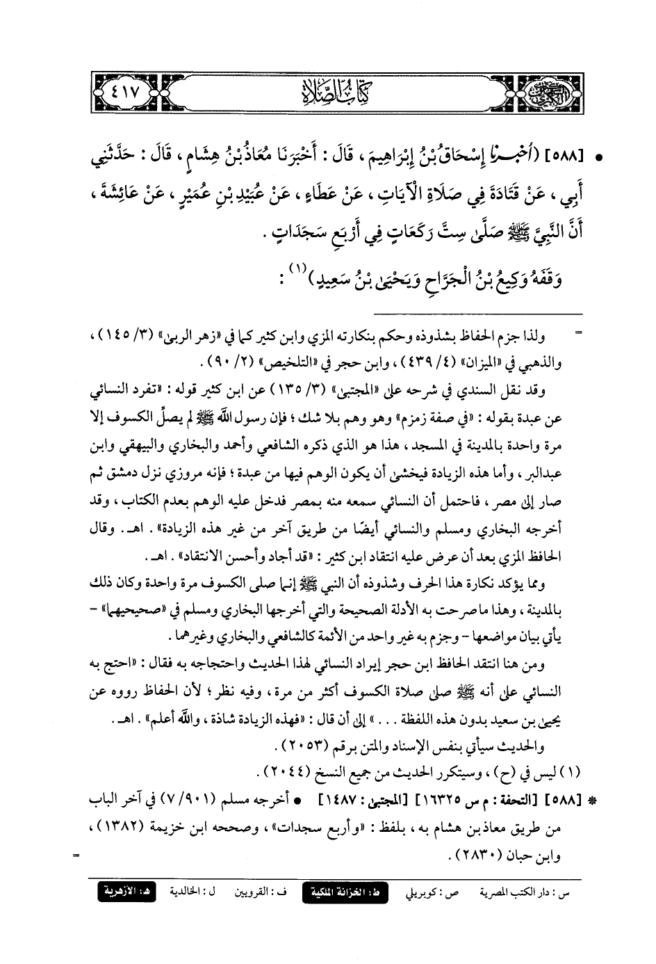 588- أَخبَرنا إِسحَاقُ بنُ إِبرَاهِيمَ، قَالَ: أَخبَرنا مُعَاذُ بنُ هِشَامٍ، قَالَ: حَدَّثني أَبي، عَن قَتَادَةَ فِي صَلاةِ الآيَاتِ، عَن عَطَاءٍ، عَن عُبَيدِ بنِ عُمَيْرٍ، عَن عَائِشَةَ، أَنَّ النَّبيَّ صَلى الله عَليه وسَلم صَلَّى سِتَّ رَكَعَاتٍ فِي أَرْبَعِ سَجَدَاتٍ.
