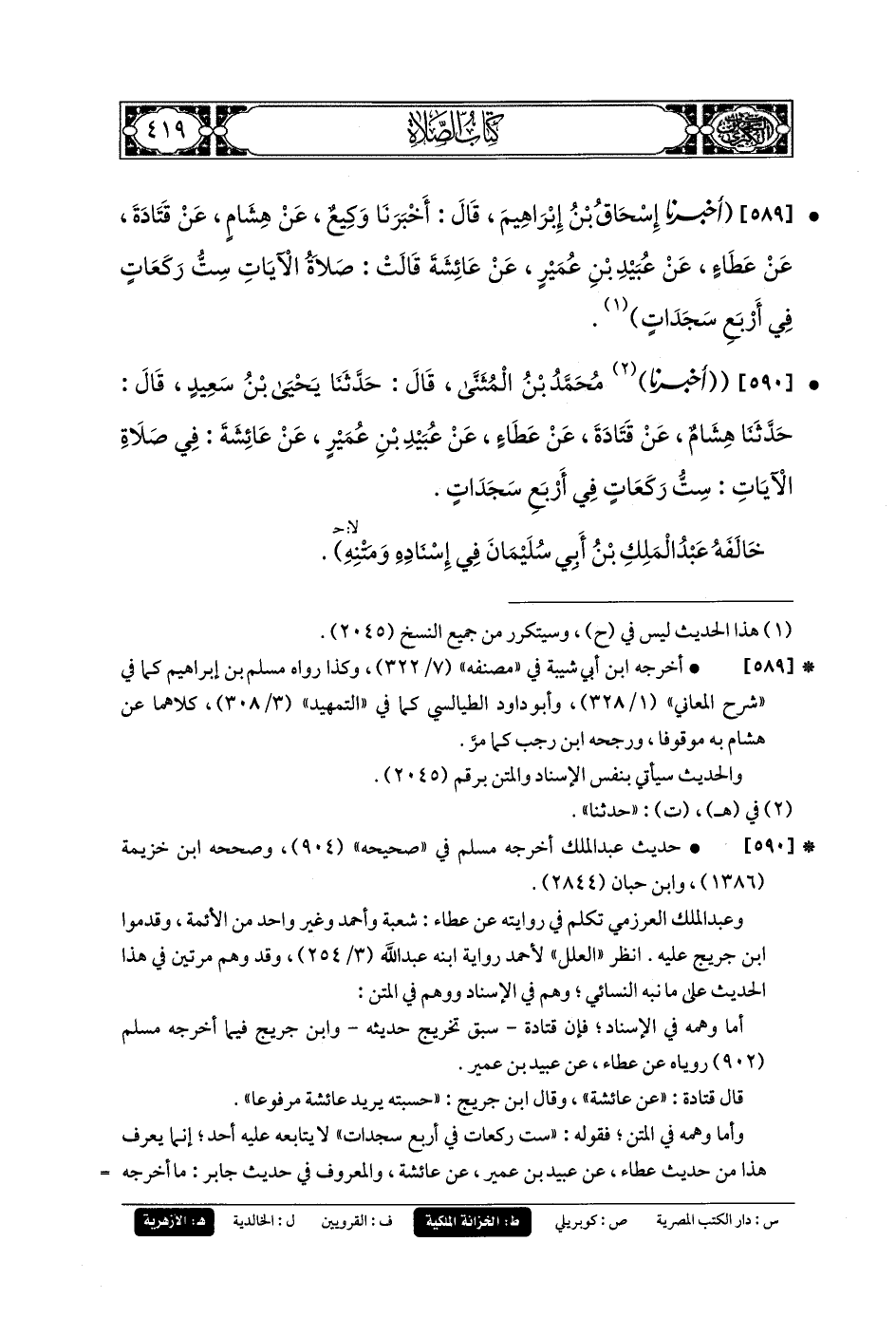 589- أَخبَرنا إِسحَاقُ بنُ إِبرَاهِيمَ، قَالَ: أَخبَرنا وَكِيعٌ، عَن هِشَامٍ، عَن قَتَادَةَ، عَن عَطَاءٍ، عَن عُبَيدِ بنِ عُمَيْرٍ، عَن عَائِشَةَ قَالَتْ: صَلاةُ الآيَاتِ سِتُّ رَكَعَاتٍ فِي أَرْبَعِ سَجَدَاتٍ.