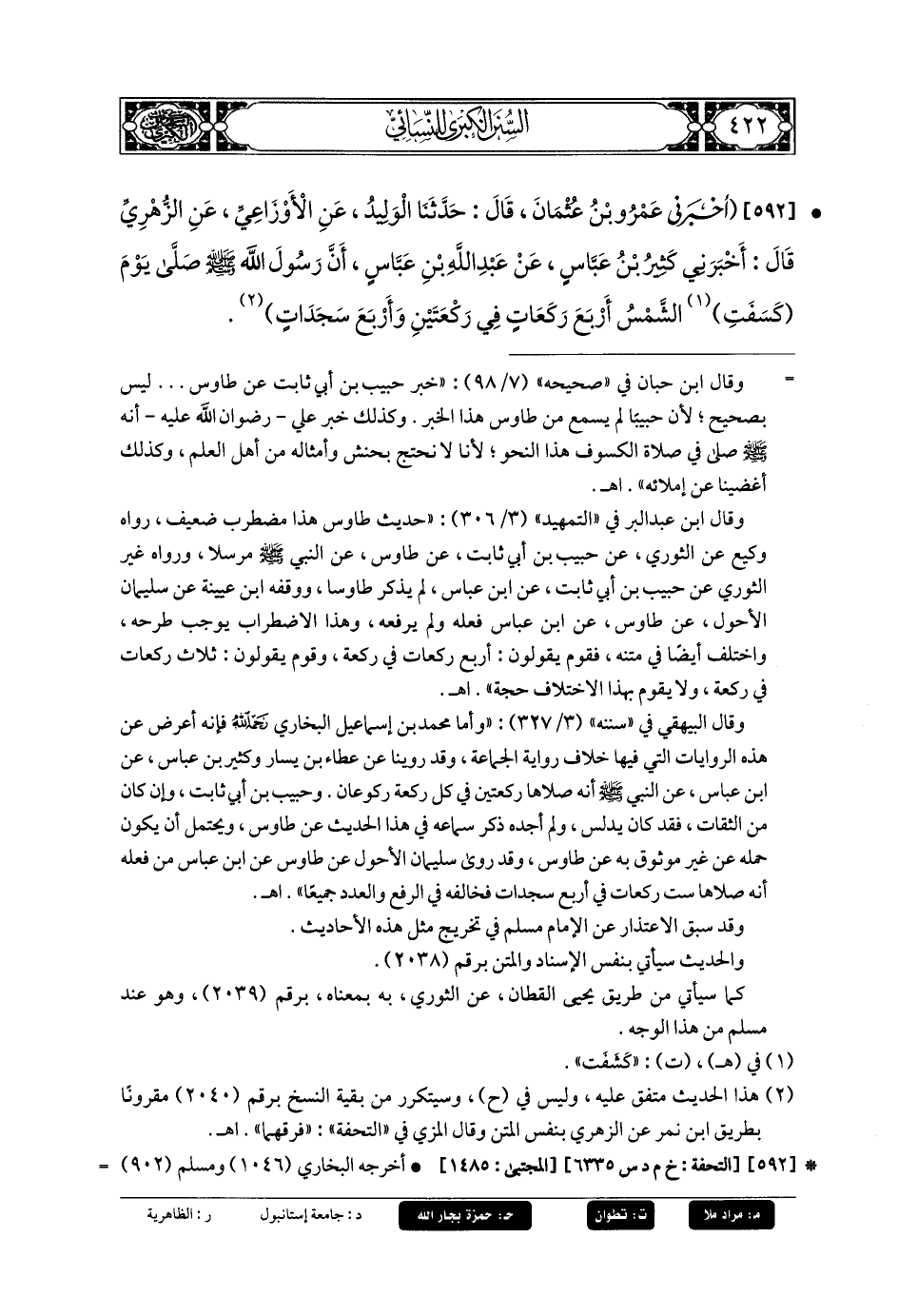 592- أَخبَرني عَمرُو بنُ عُثْمَانَ، قَالَ: حَدثنا الوَلِيدُ، عَنِ الأَوْزَاعِيِّ، عَنِ الزُّهْرِيِّ، قَالَ: أَخبَرني كَثِيرُ بنُ عَبَّاسٍ، عَن عَبدِ اللهِ بنِ عَبَّاسٍ، أَنَّ رَسُولَ اللهِ صَلى الله عَليه وسَلم صَلَّى يَوْمَ كَسَفَتِ الشَّمْسُ أَرْبَعَ رَكَعَاتٍ فِي رَكْعَتَيْنِ وَأَرْبَعَ سَجَدَاتٍ.
