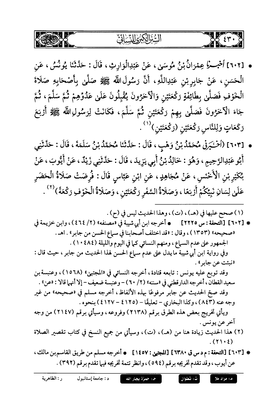 602- أَخبَرنا عِمْرَانُ بنُ مُوسَى، عَن عَبدِ الوَارِثِ، قَالَ: حَدثنا يُونُسُ، عَنِ الحَسَنِ، عَن جَابِرِ بنِ عَبدِ اللهِ، أَنَّ رَسُولَ اللهِ صَلى الله عَليه وسَلم صَلَّى بِأَصْحَابِهِ صَلاةَ الخَوْفِ، فَصَلَّى بِطَائِفَةٍ رَكْعَتَيْنِ، وَالآخَرُونَ يُقْبِلُونَ عَلَى عَدُوِّهِمْ، ثُمَّ سَلَّمَ، ثُمَّ جَاءَ الآخَرُونَ فَصَلَّى بِهِمْ رَكْعَتَيْنِ، ثُمَّ سَلَّمَ، فَكَانَتْ لِرَسُولِ اللهِ صَلى الله عَليه وسَلم أَرْبَعَ رَكَعَاتٍ، وَلِلنَّاسِ رَكْعَتَيْنِ رَكْعَتَيْنِ.