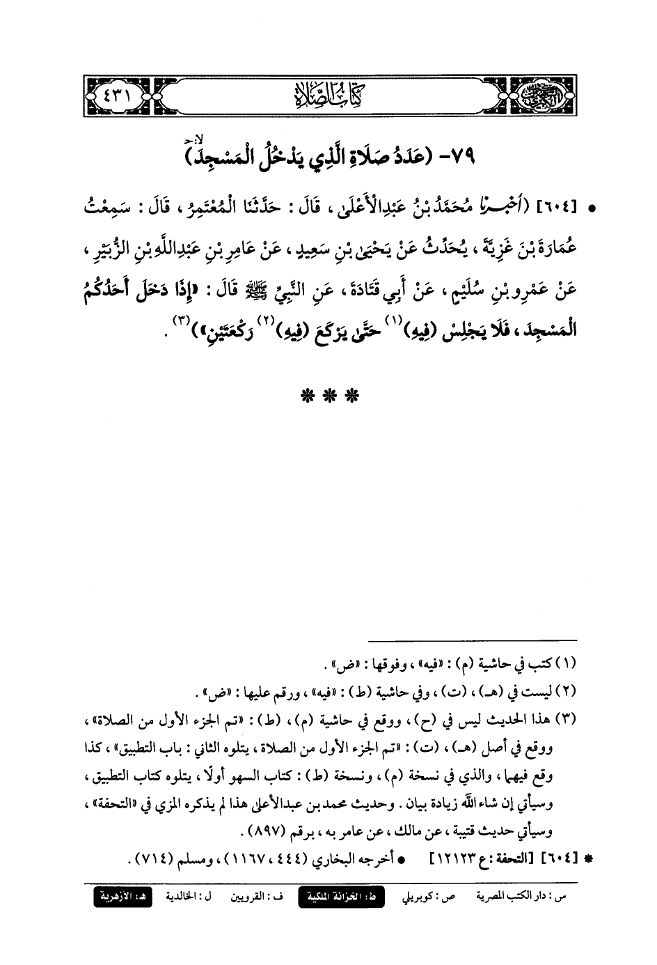 604- أَخبَرنا مُحَمدُ بنُ عَبدِ الأَعْلَى، قَالَ: حَدثنا المُعْتَمِرُ، قَالَ: سَمِعْتُ عُمَارَةَ بْنَ غَزِيَّةَ، يُحَدِّثُ عَن يَحيَى بنِ سَعِيدٍ، عَن عَامِرِ بنِ عَبدِ اللهِ بنِ الزُّبَيْرِ، عَن عَمْرِو بنِ سُلَيْمٍ، عَن أَبي قَتَادَةَ، عَنِ النَّبيِّ صَلى الله عَليه وسَلم قَالَ: إِذَا دَخَلَ أَحَدُكُمُ المَسْجِدَ فَلا يَجْلِسْ فِيهِ حَتَّى يَرْكَعَ فِيهِ رَكْعَتَيْنِ.