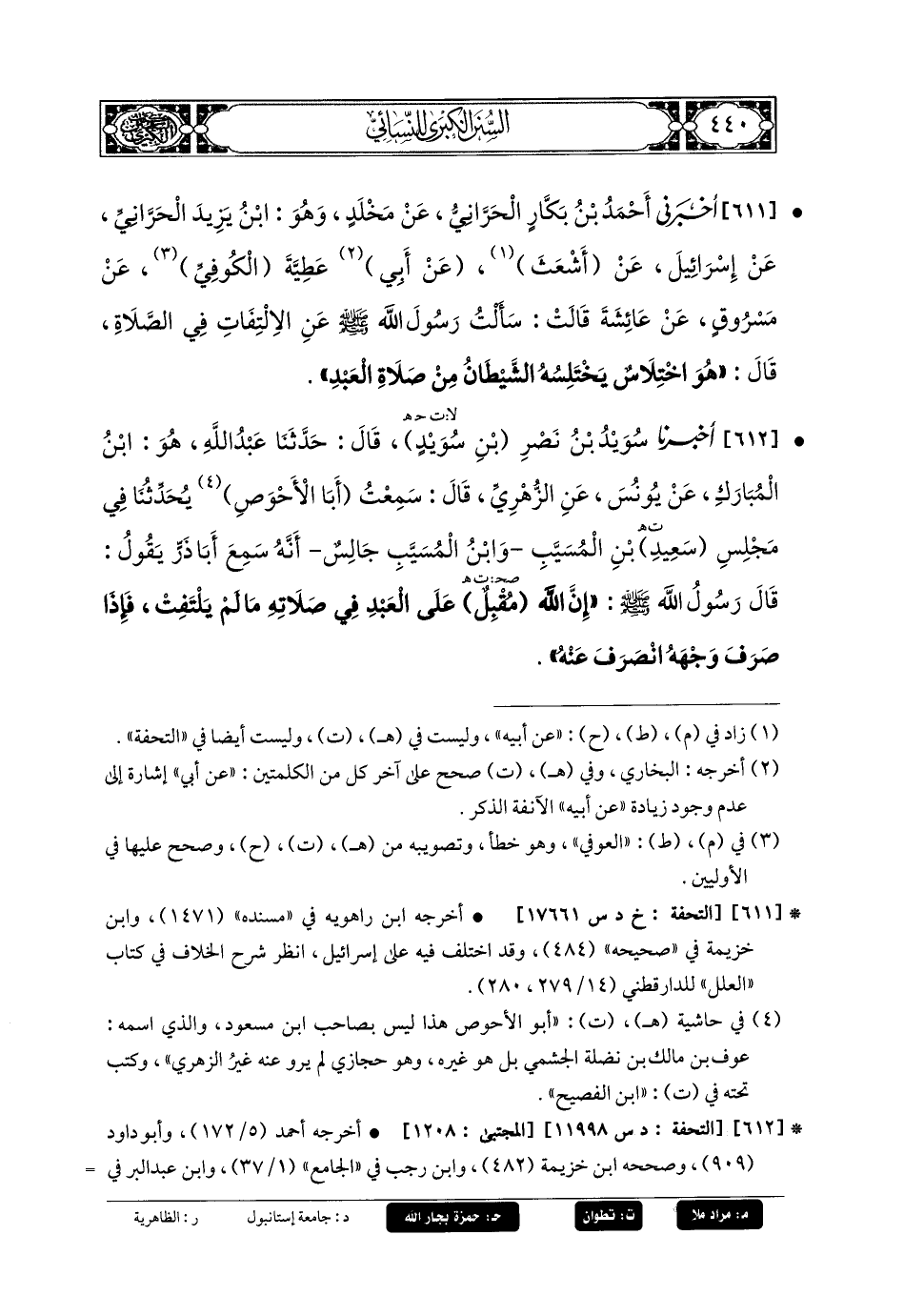 611- أَخبَرني أَحْمَدُ بنُ بَكَّارٍ الحَرَّانِيُّ، عَن مَخْلَدٍ، وَهُوَ ابنُ يَزِيدَ الحَرَّانِيُّ، عَن إِسرَائِيلَ، عَن أَشْعَثَ، عَن أَبي عَطِيَّةَ الكُوفِيِّ، عَن مَسْرُوقٍ، عَن عَائِشَةَ قَالَتْ: سَأَلْتُ رَسُولَ اللهِ صَلى الله عَليه وسَلم عَنِ الاِلْتِفَاتِ فِي الصَّلاةِ قَالَ: هُوَ اخْتِلاسٌ يَخْتَلِسُهُ الشَّيْطَانُ مِنْ صَلاةِ العَبدِ.