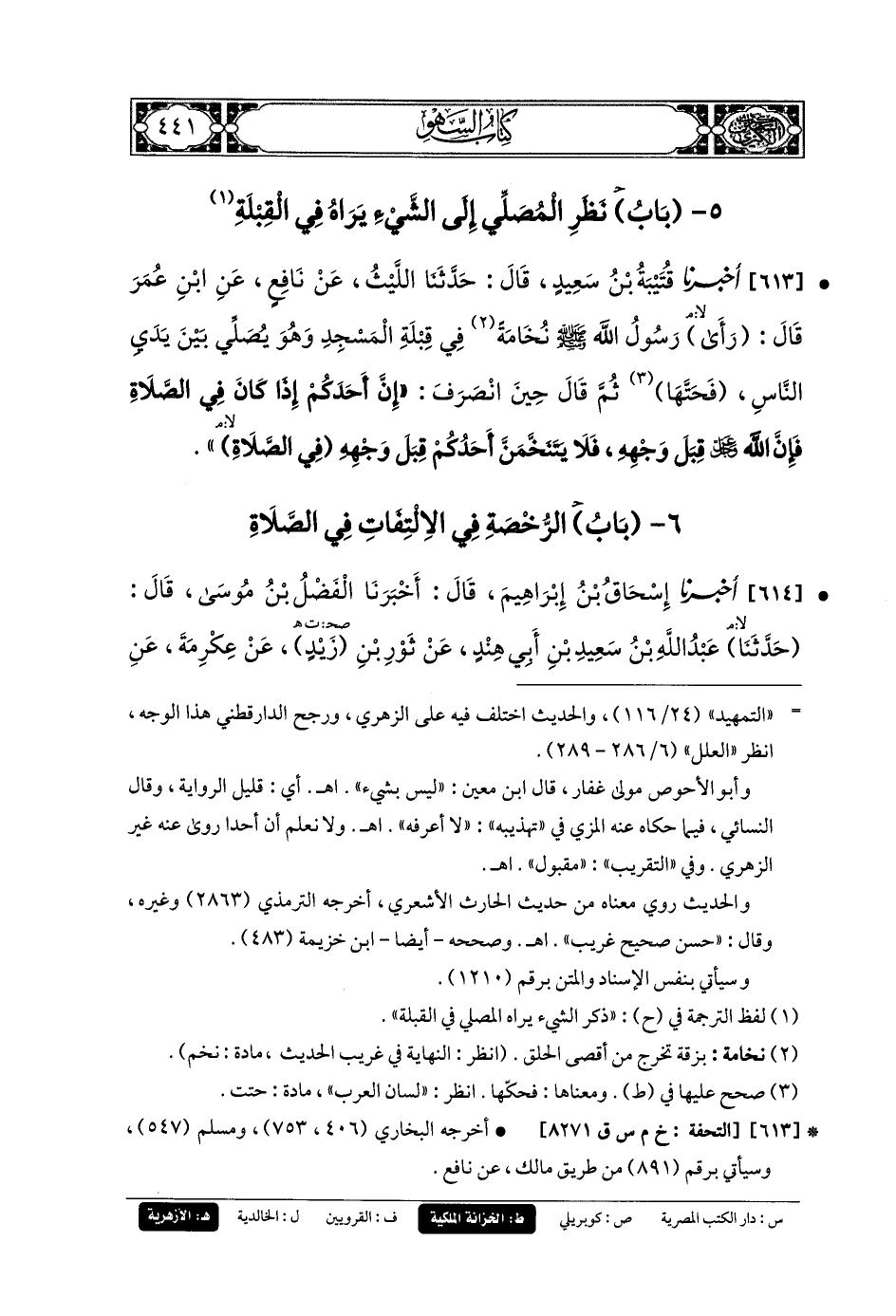 613- أَخبَرنا قُتَيبَةُ بنُ سَعِيدٍ، قَالَ: حَدثنا اللَّيْثُ، عَن نَافِعٍ، عَنِ ابنِ عُمَرَ قَالَ: رَأَى رَسُولُ اللهِ صَلى الله عَليه وسَلم نُخَامَةً فِي قِبْلَةِ المَسْجِدِ وَهُوَ يُصَلِّي بَيْنَ يَدَيِ النَّاسِ فَحَتَّهَا، ثُمَّ قَالَ حِينَ انْصَرَفَ: إِنَّ أَحَدَكُمْ إِذَا كَانَ فِي الصَّلاةِ فَإِنَّ اللهَ عزَّ وجلَّ قِبَلَ وَجْهِهِ، فَلا يَتَنَخَّمَنَّ أَحَدُكُمْ قِبَلَ وَجْهِهِ فِي الصَّلاةِ.