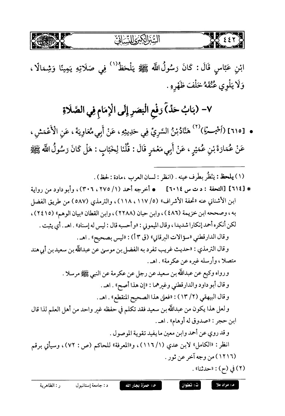 7- بَابُ حَدِّ رَفْعِ البَصَرِ إِلَى الإِمَامِ فِي الصَّلاةِ.