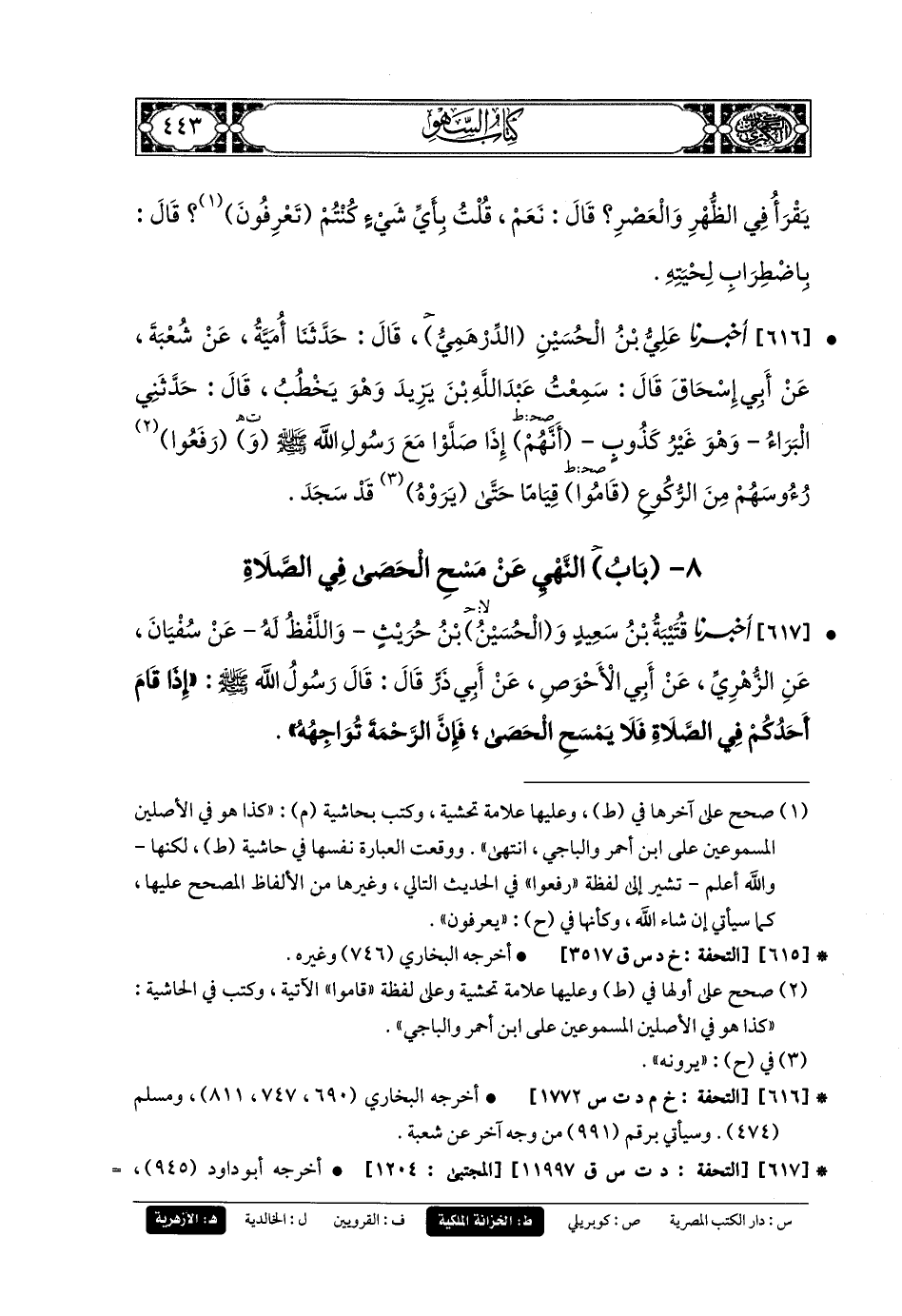 8- بَابُ النَّهْيِ عَن مَسَحِ الحَصَى فِي الصَّلاةِ.