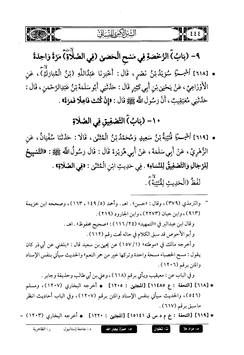 619- أَخبَرنا قُتَيبَةُ بنُ سَعِيدٍ، وَمُحَمدُ بنُ المُثَنَّى، قَالا: حَدثنا سُفيانُ، عَنِ الزُّهْرِيِّ، عَن أَبي سَلَمَةَ، عَن أَبي هُرَيرَةَ قَالَ: قَالَ رَسُولُ اللهِ صَلى الله عَليه وسَلم: التَّسْبِيحُ لِلرِّجَالِ، وَالتَّصْفِيقُ لِلنِّسَاءِ. فِي حَدِيثِ ابنِ المُثَنَّى فِي الصَّلاةِ.
