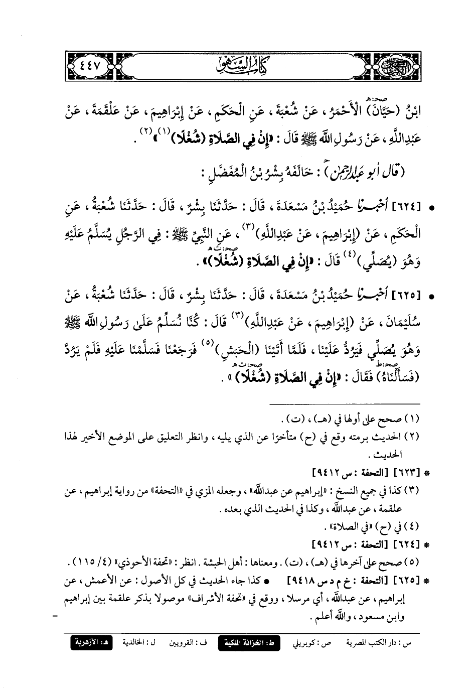 625- أَخبَرنا حُمَيْدُ بنُ مَسْعَدَةَ، قَالَ: حَدثنا بِشْرُ، قَالَ: حَدثنا شُعبَةُ، عَن سُلَيمَانَ، عَن إِبرَاهِيمَ، عَن عَبدِ اللهِ (1)، قَالَ: كُنَّا نُسَلِّمُ عَلَى رَسُولِ اللهِ صَلى الله عَليه وسَلم، وَهُوَ يُصَلِّي فَيَرُدُّ عَلَيْنَا، فَلَمَّا أَتَيْنَا الحَبَشَ فَرَجَعْنَا، فَسَلَّمْنَا عَلَيْهِ فَلَمْ يَرُدَّ، فَسَأَلْنَاهُ، فَقَالَ: إِنَّ فِي الصَّلاةِ شُغْلاً.