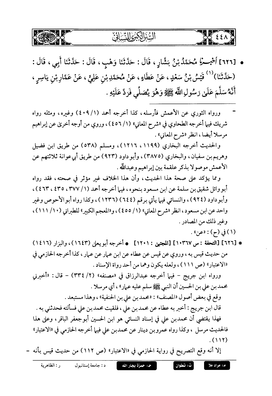 626- أَخبَرنا مُحَمدُ بنُ بَشَّارٍ، قَالَ: حَدثنا وَهْبٌ، قَالَ: حَدثنا أَبي، قَالَ: حَدثنا قَيْسُ بنُ سَعْدٍ، عَن عَطَاءٍ، عَن مُحَمدِ بنِ عَليٍّ، عَن عَمَّارِ بنِ يَاسِرٍ، أَنَّهُ سَلَّمَ عَلَى رَسُولِ اللهِ صَلى الله عَليه وسَلم وَهُوَ يُصَلِّي فَرَدَّ عَلَيْهِ.
