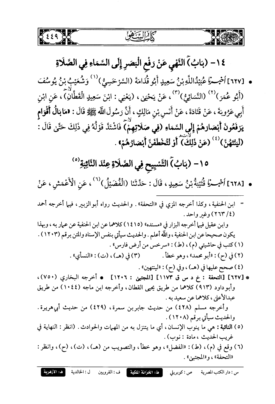 627- أَخبَرنا عُبَيدُ اللهِ بنُ سَعِيدٍ أَبو قُدَامَةَ السَّرَخْسِيُّ، وَشُعَيبُ بنُ يُوسُفَ أَبو عُمَرَ النَّسَائِيُّ، عَن يَحيَى، يَعْنِي ابنَ سَعِيدٍ القَطَّانَ، عَنِ ابنِ أَبي عَرُوبَةَ، عَن قَتَادَةَ، عَن أَنَسِ بنِ مَالِكٍ، أَنَّ رَسُولَ اللهِ صَلى الله عَليه وسَلم قَالَ: مَا بَالُ أَقْوَامٍ يَرْفَعُونَ أَبْصَارَهُمْ إِلَى السَّمَاءِ فِي صَلاتِهِمْ، فَاشْتَدَّ قَوْلُهُ فِي ذَلِكَ حَتَّى قَالَ: لَيَنْتَهُنَّ عَن ذَلِكَ أَوْ لَتُخْطَفَنَّ أَبْصَارُهُمْ.