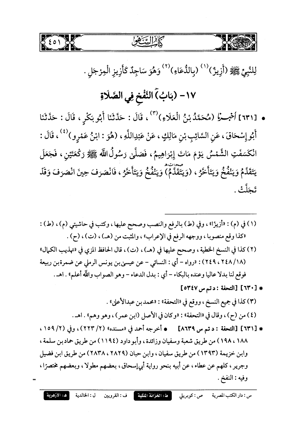 631- أَخبَرنا مُحَمدُ بنُ العَلاءِ، قَالَ: حَدثنا أَبو بَكْرٍ، قَالَ: حَدثنا أَبو إِسحَاقَ، عَنِ السَّائِبِ بنِ مَالِكٍ، عَن عَبدِ اللهِ هُوَ ابنُ عَمرٍو، قَالَ: انْكَسَفَتِ الشَّمْسُ يَوْمَ مَاتَ إِبرَاهِيمُ، فَصَلَّى رَسُولُ اللهِ صَلى الله عَليه وسَلم رَكْعَتَيْنِ فَجَعَلَ يَتَقَدَّمُ وَيَنْفُخُ وَيَتَأَخَّرُ، وَيَتَقَدَّمُ وَيَنْفُخُ وَيَتَأَخَّرُ، فَانْصَرَفَ حِينَ انْصَرَفَ وَقَدْ تَجَلَّتْ.