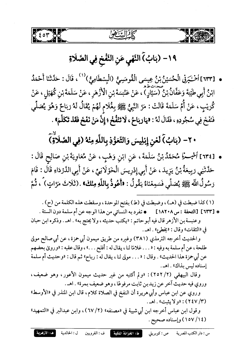 633- أَخبَرني الحُسَيْنُ بنُ عِيسَى القُومَسِيُّ البِسْطَامِيُّ، قَالَ: حَدثنا أَحْمَدُ بنُ أَبي طَيْبَةَ، وَعَفَّانُ بنُ سَيَّارٍ، عَن عَنبَسَةَ بنِ الأَزْهَرِ، عَن سَلَمَةَ بنِ كُهَيْلٍ، عَن كُرَيْبٍ، عَن أُمِّ سَلَمَةَ قَالَتْ: مَرَّ النَّبيُّ صَلى الله عَليه وسَلم بِغُلامٍ لَهُمْ يُقَالُ لَهُ: رَبَاحٌ وَهُوَ يُصَلِّي فَنَفَخَ فِي سُجُودِهِ، فَقَالَ لَهُ: يَا رَبَاحُ لا تَنْفُخْ، إِنَّ مَنْ نَفَخَ فَقَدْ تَكَلَّمَ.