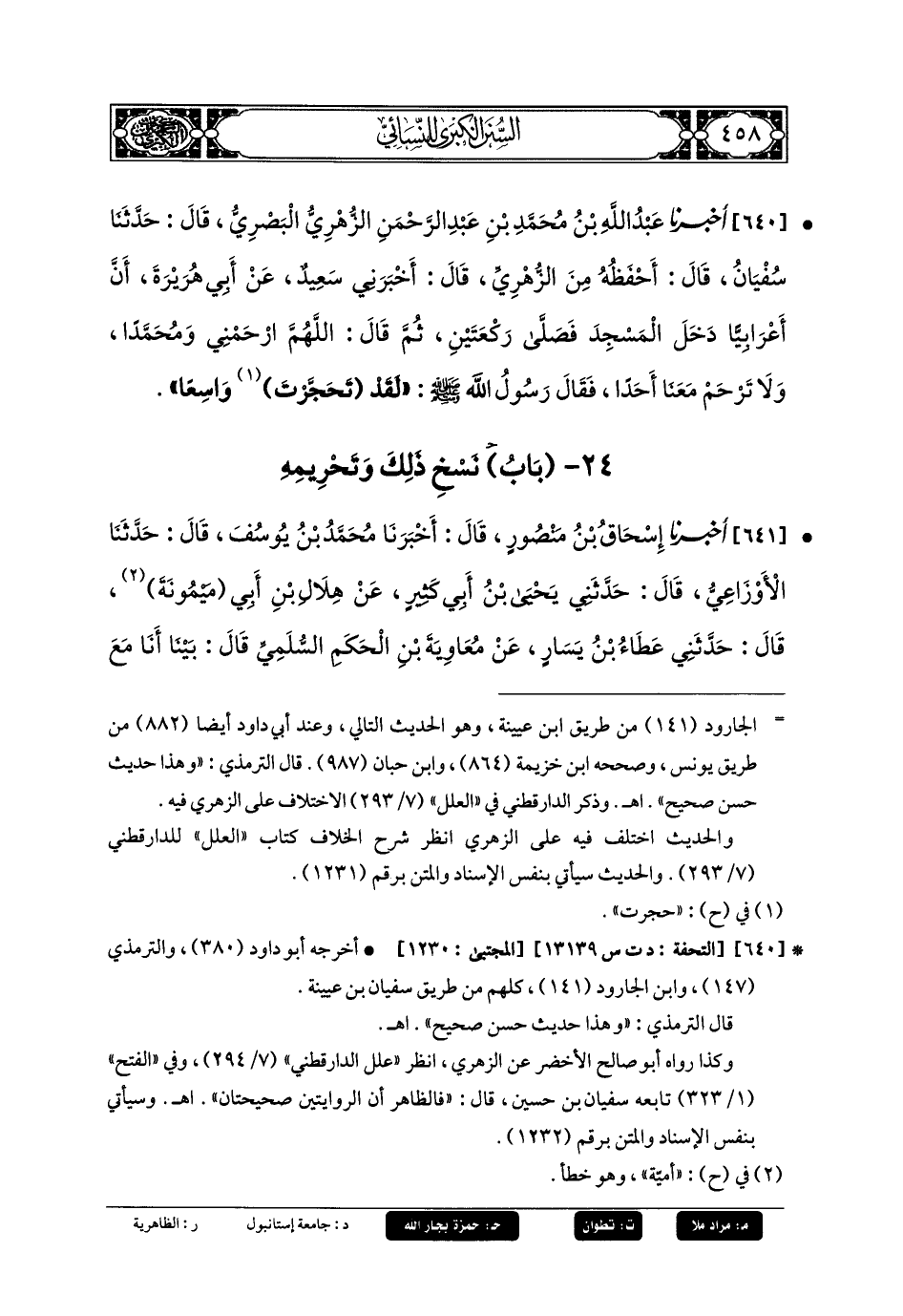 640- أَخبَرنا عَبدُ اللهِ بنُ مُحَمدِ بنِ عَبدِ الرَّحمَنِ الزُّهْرِيُّ البَصْرِيُّ، قَالَ: حَدثنا سُفيانُ قَالَ: أَحْفَظْهُ مِنَ الزُّهْرِيِّ، قَالَ: أَخبَرني سَعِيدٌ، عَن أَبي هُرَيرَةَ، أَنَّ أَعْرَابِيًّا دَخَلَ المَسْجِدَ فَصَلَّى رَكْعَتَيْنِ، ثُمَّ قَالَ: اللهُمَّ ارْحَمْنِي وَمُحَمدًا وَلا تَرْحَمْ مَعَنَا أَحَدًا، فَقَالَ رَسُولُ اللهِ صَلى الله عَليه وسَلم: لَقَدْ تَحَجَّرْتَ وَاسِعًا.