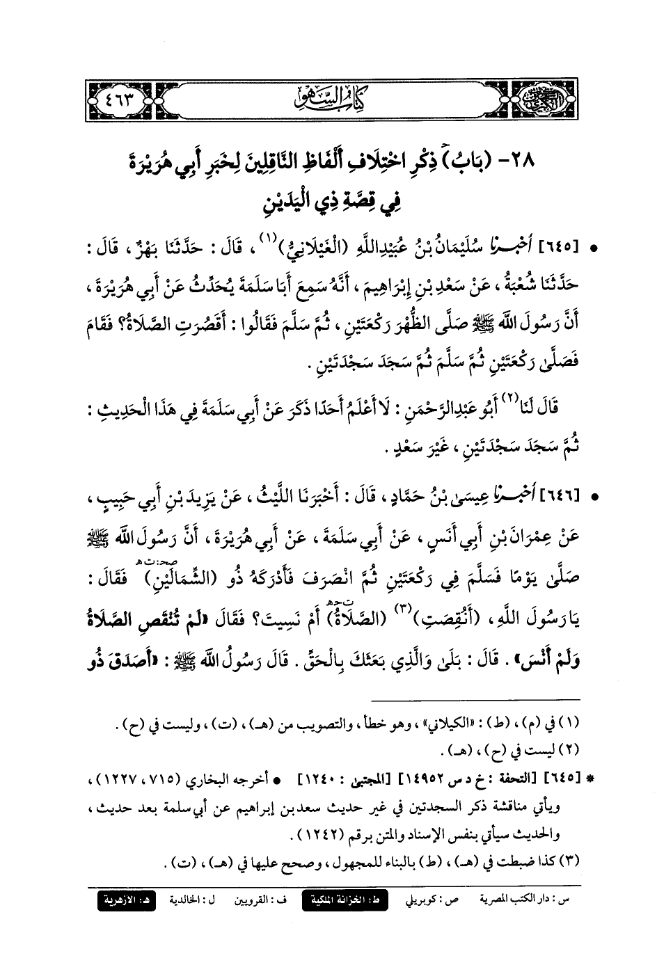 104- بَابُ ذَكَرِ اخْتِلافِ أَلْفَاظِ النَّاقِلِينَ لِخَبَرِ أَبي هُرَيرَةَ فِي قِصَّةِ ذِي اليَدَيْنِ.