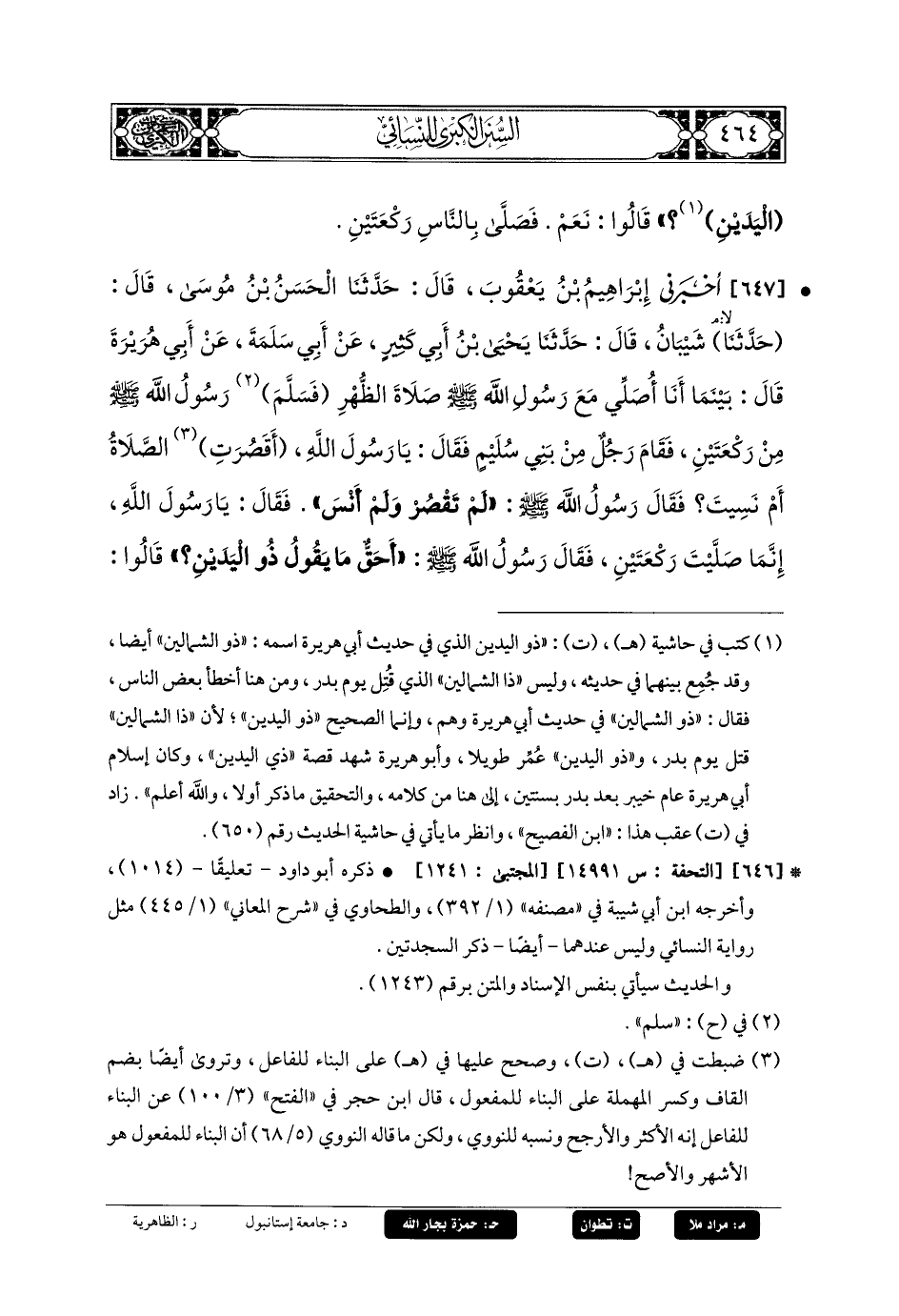 647- أَخبَرني إِبرَاهِيمُ بنُ يَعقُوبَ، قَالَ: حَدثنا الحَسَنُ بنُ مُوسَى، قَالَ: حَدثنا شَيْبَانُ، قَالَ: حَدثنا يَحيَى بنُ أَبي كَثِيرٍ، عَن أَبي سَلَمَةَ، عَن أَبي هُرَيرَةَ قَالَ: بَيْنَمَا أَنَا أُصَلِّي مَعَ رَسُولِ اللهِ صَلى الله عَليه وسَلم صَلاةَ الظُّهْرِ، فَسَلَّمَ رَسُولُ اللهِ صَلى الله عَليه وسَلم مِنْ رَكْعَتَيْنِ، فَقَامَ رَجُلٌ مِنْ بَنِي سُلَيْمٍ، فَقَالَ: يَا رَسُولَ اللهِ، أَقَصُرَتِ الصَّلاةُ أَمْ نَسِيتَ؟ فَقَالَ رَسُولُ اللهِ صَلى الله عَليه وسَلم: لَمْ تُقْصَرْ وَلَمْ أَنَسَ، فَقَالَ: يَا رَسُولَ اللهِ، إِنَّمَا صَلَّيْتَ رَكْعَتَيْنِ، فَقَالَ رَسُولُ اللهِ صَلى الله عَليه وسَلم: أَحَقٌّ مَا يَقُولُ ذُو اليَدَيْنِ؟ قَالُوا: نَعَمْ، فَقَامَ فَصَلَّى بِهِمْ رَكْعَتَيْنِ.