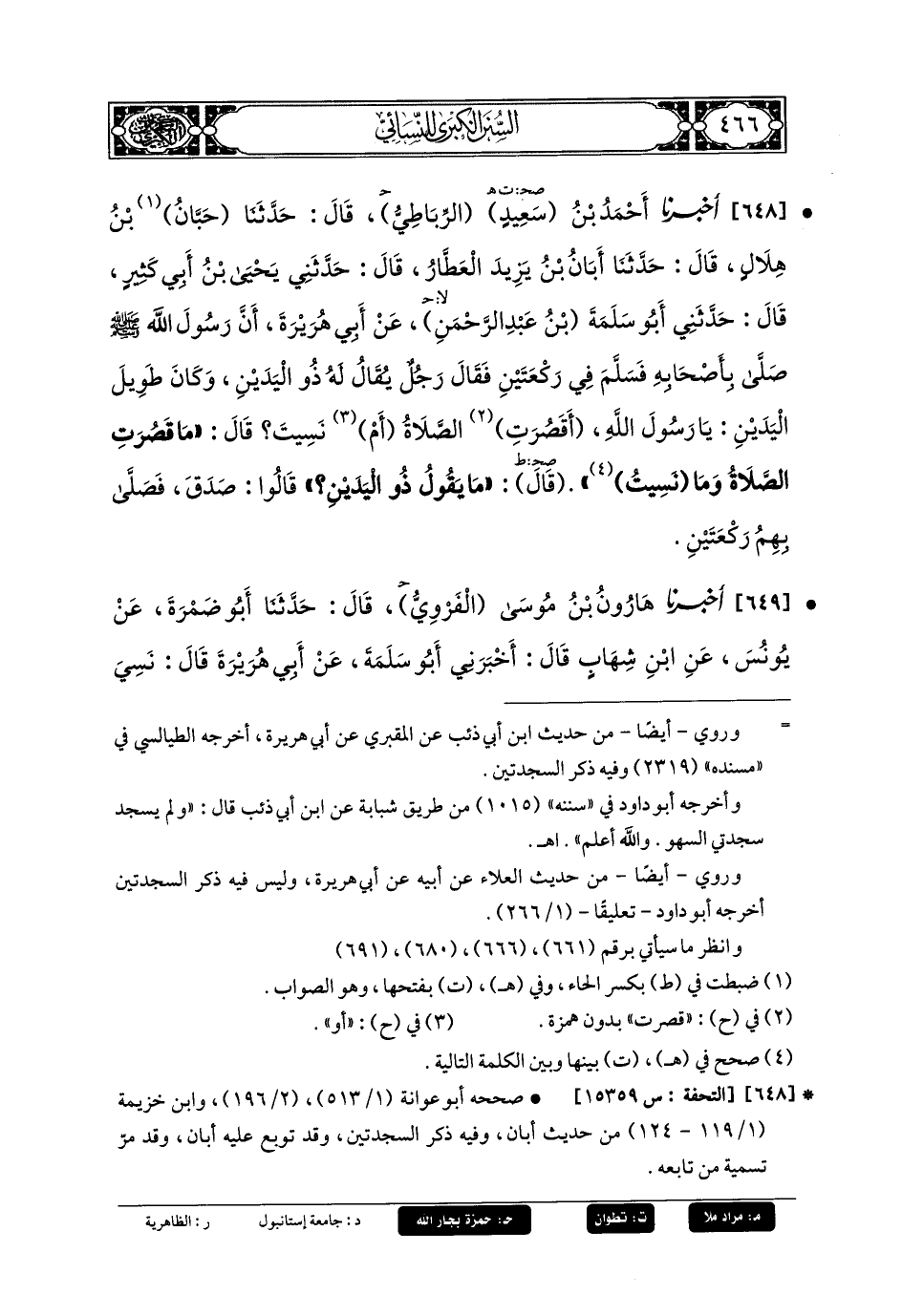 649- أَخبَرنا هَارُونُ بنُ مُوسَى الفَرْوِيُّ، قَالَ: حَدثنا أَبو ضَمْرَةَ، عَن يُونُسَ، عَنِ ابنِ شِهَابٍ، قَالَ: أَخبَرني أَبو سَلَمَةَ، عَن أَبي هُرَيرَةَ قَالَ: نَسِيَ رَسُولُ اللهِ صَلى الله عَليه وسَلم فَسَلَّمَ فِي سَجْدَتَيْنِ، فَقَالَ لَهُ ذُو الشِّمَالَيْنِ: أَقَصُرَتِ الصَّلاةُ أَمْ نَسِيتَ يَا رَسُولَ اللهِ؟ قَالَ رَسُولُ اللهِ صَلى الله عَليه وسَلم: أَصَدَقَ ذُو اليَدَيْنِ؟ قَالُوا: نَعَمْ. فَقَامَ رَسُولُ اللهِ صَلى الله عَليه وسَلم فَأَتَمَّ الصَّلاةَ.