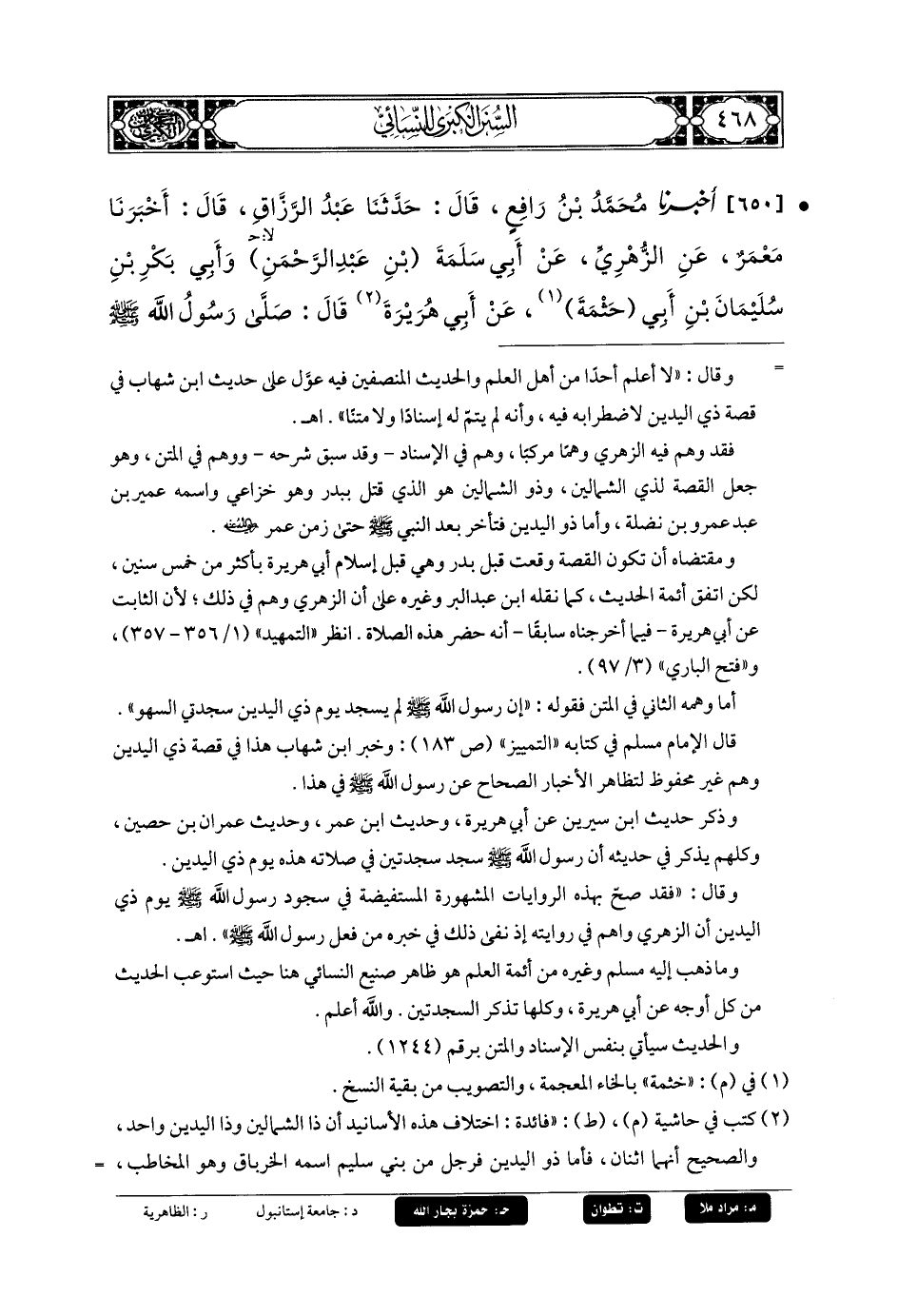 650- أَخبَرنا مُحَمدُ بنُ رَافِعٍ، قَالَ: حَدثنا عَبدُ الرَّزَّاقِ، قَالَ: أَخبَرنا مَعْمَرٌ، عَنِ الزُّهْرِيِّ، عَن أَبي سَلَمَةَ بنِ عَبدِ الرَّحمَنِ، وَأَبي بَكْرِ بنِ سُلَيمَانَ بنِ أَبي حَثْمَةَ، عَن أَبي هُرَيرَةَ قَالَ: صَلَّى رَسُولُ اللهِ صَلى الله عَليه وسَلم الظُّهْرَ أَوِ العَصْرَ فَسَلَّمَ فِي رَكْعَتَيْنِ، فَقَالَ لَهُ ذُو الشِّمَالَيْنِ ابنُ عَمْرٍو، أَنْقُصُ الصَّلاةُ أَمْ نَسِيتَ؟ فَقَالَ النَّبيُّ صَلى الله عَليه وسَلم: مَا يَقُولُ ذُو اليَدَيْنِ؟ قَالُوا: صَدَقَ يَا نَبِيَّ اللهِ، فَأَتَمَّ بِهِمُ الرَّكْعَتَيْنِ اللَّتَيْنِ نَقَصَ.